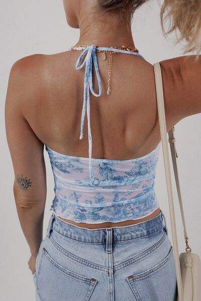Printed Mesh Bow Detail Halter Neck Tank Top