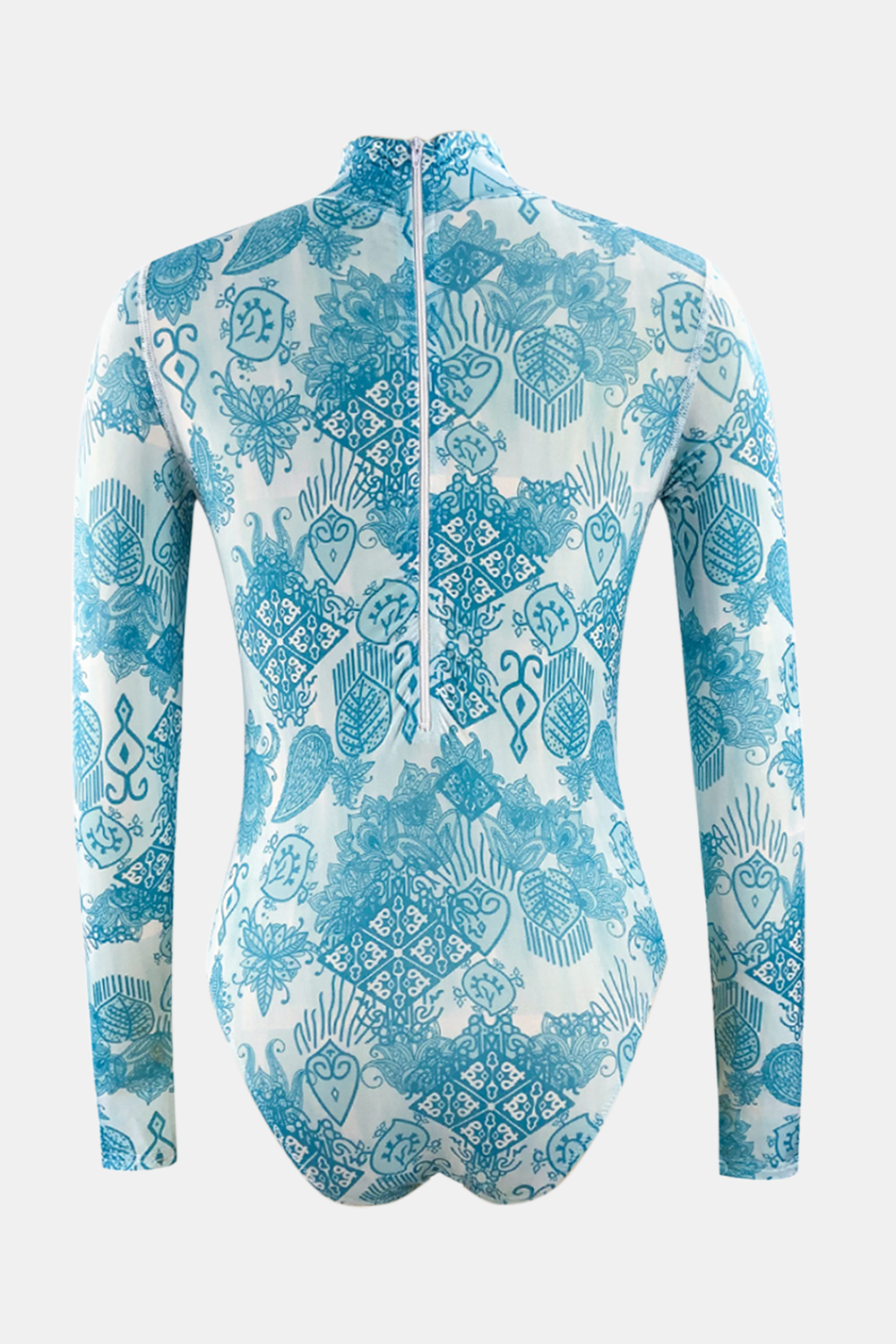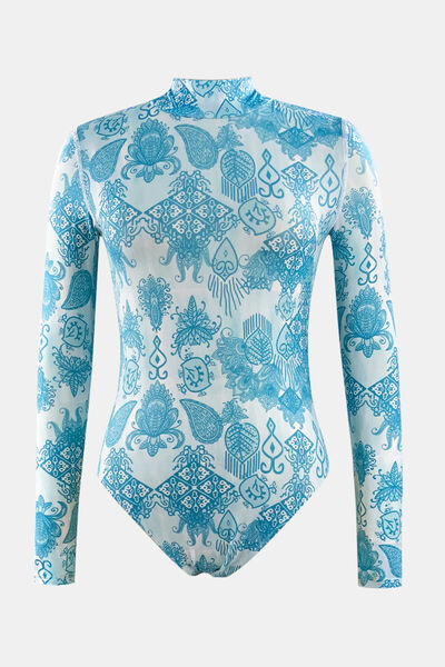 Printed Mock Neck Long Sleeve One-Piece Swimwear