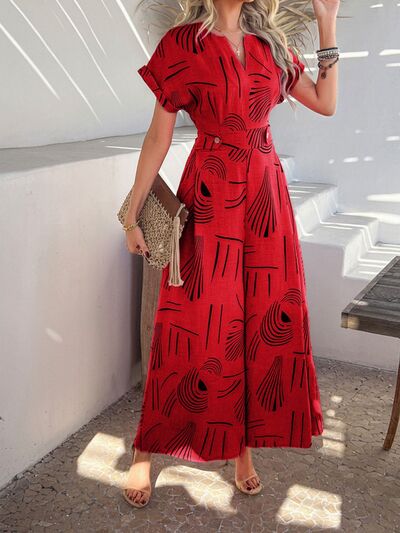 Printed Notched Short Sleeve Wide Leg Jumpsuit