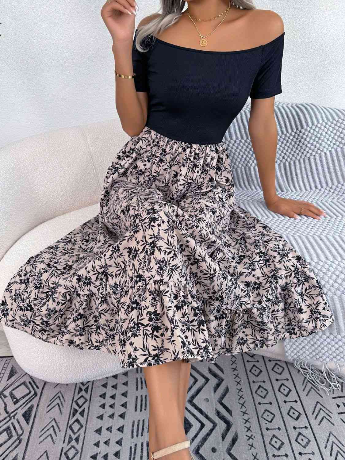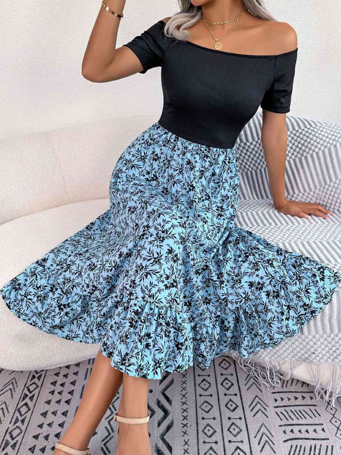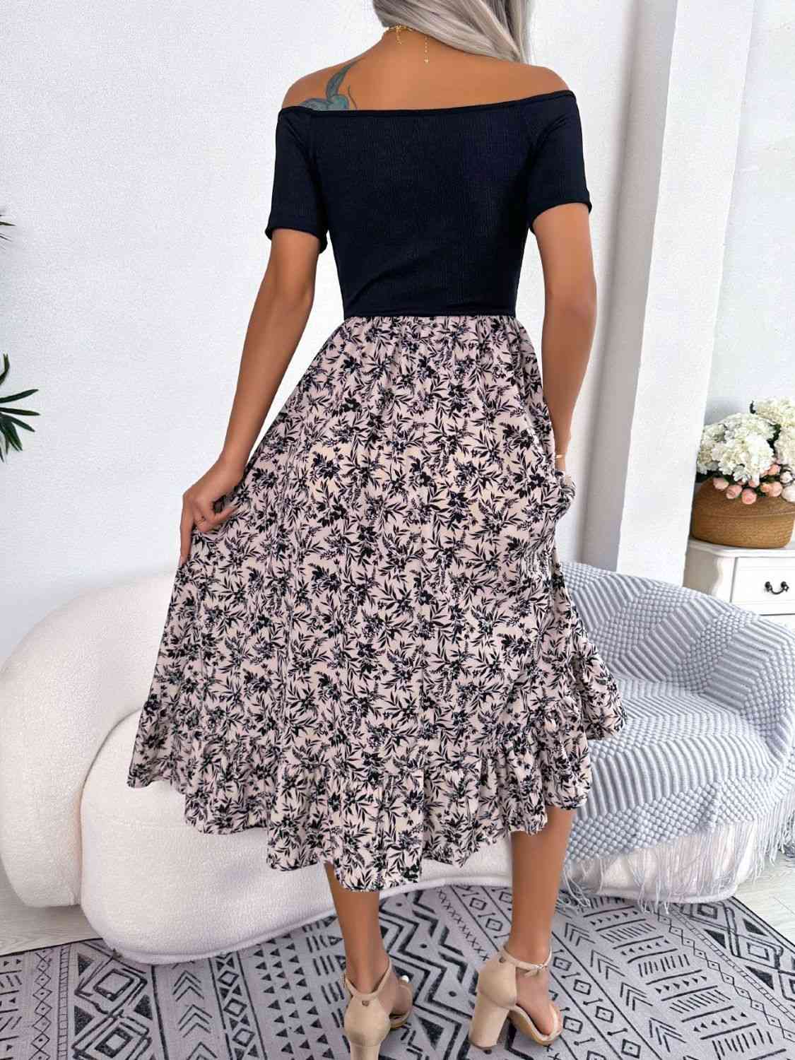 Printed Off-Shoulder Ruffle Hem Dress