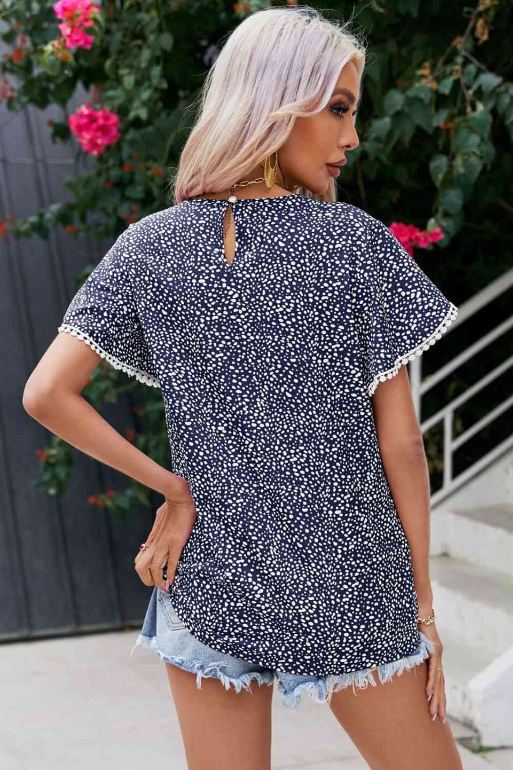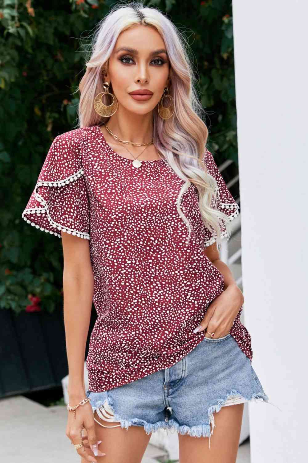 Printed Pom Pom Detail Petal Sleeve Blouse