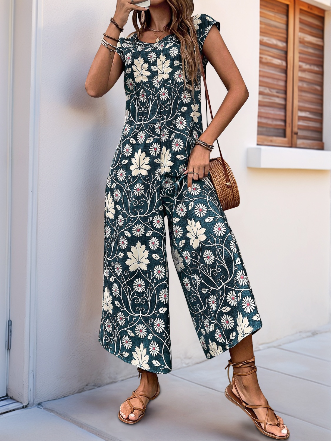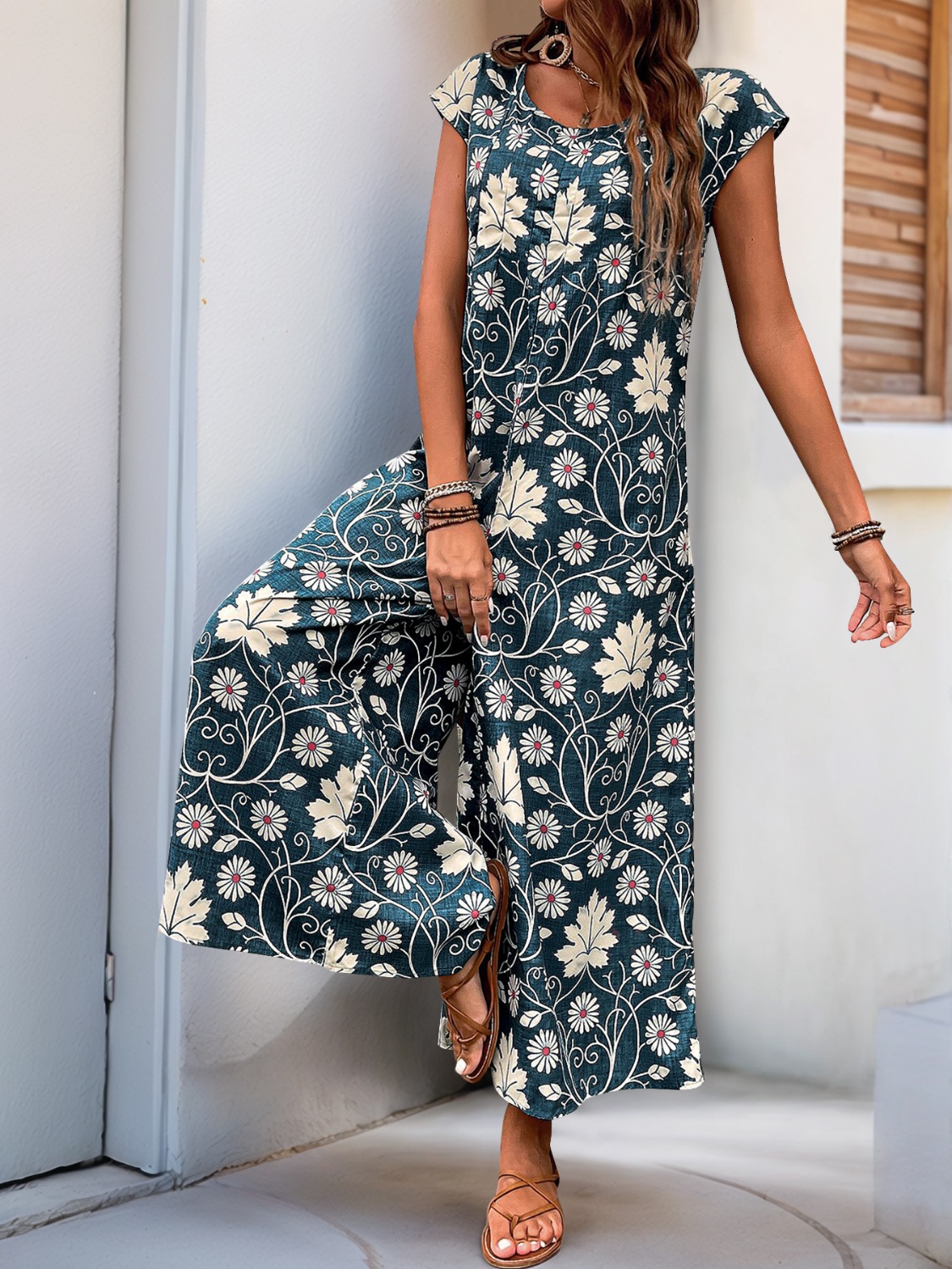 Printed Round Neck Cap Sleeve Wide Leg Jumpsuit