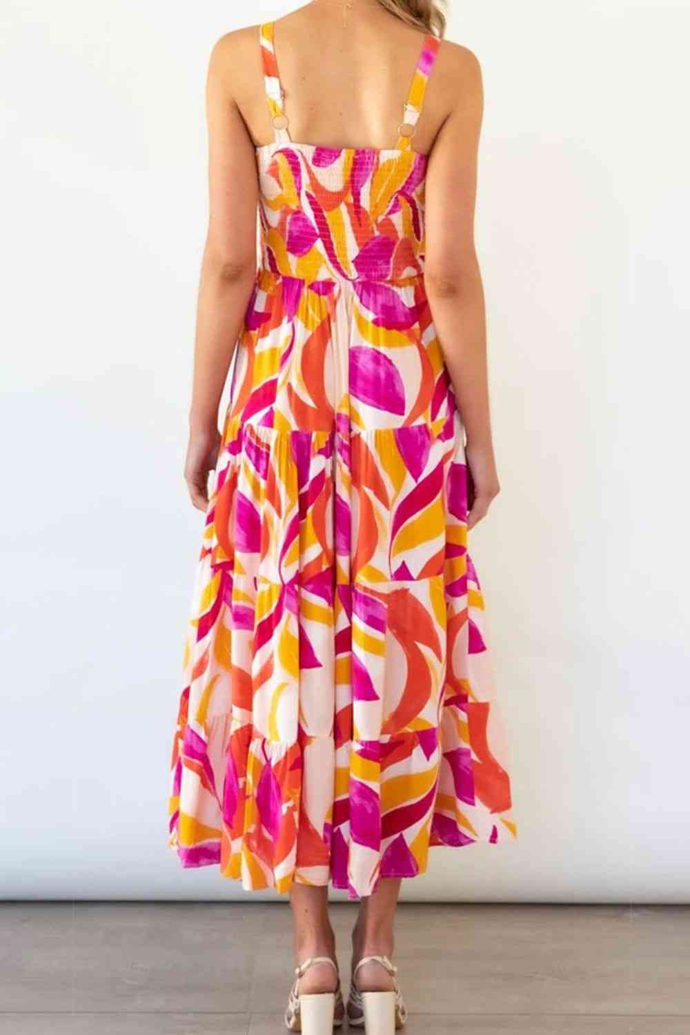 Printed Smocked Square Neck Tiered Sleeveless Dress