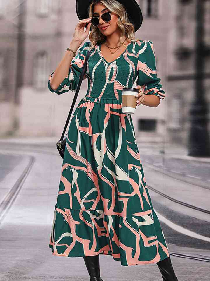 Printed Smocked V-Neck Three-Quarter Sleeve Midi Dress