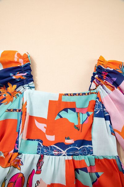 Printed Square Neck Ruffled Short Sleeve Blouse