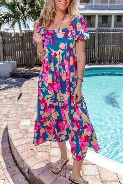 Printed Square Neck Short Sleeve Midi Dress