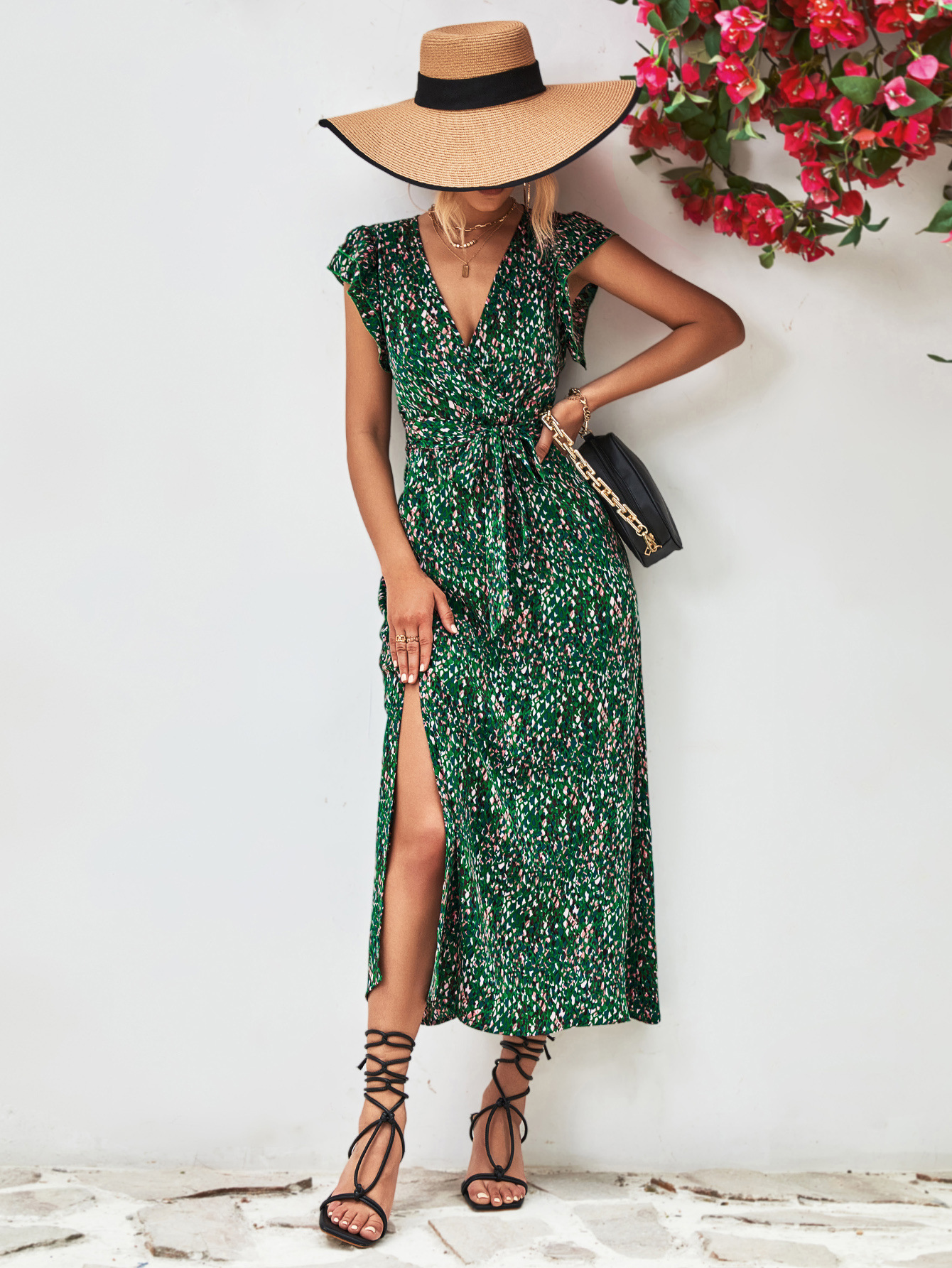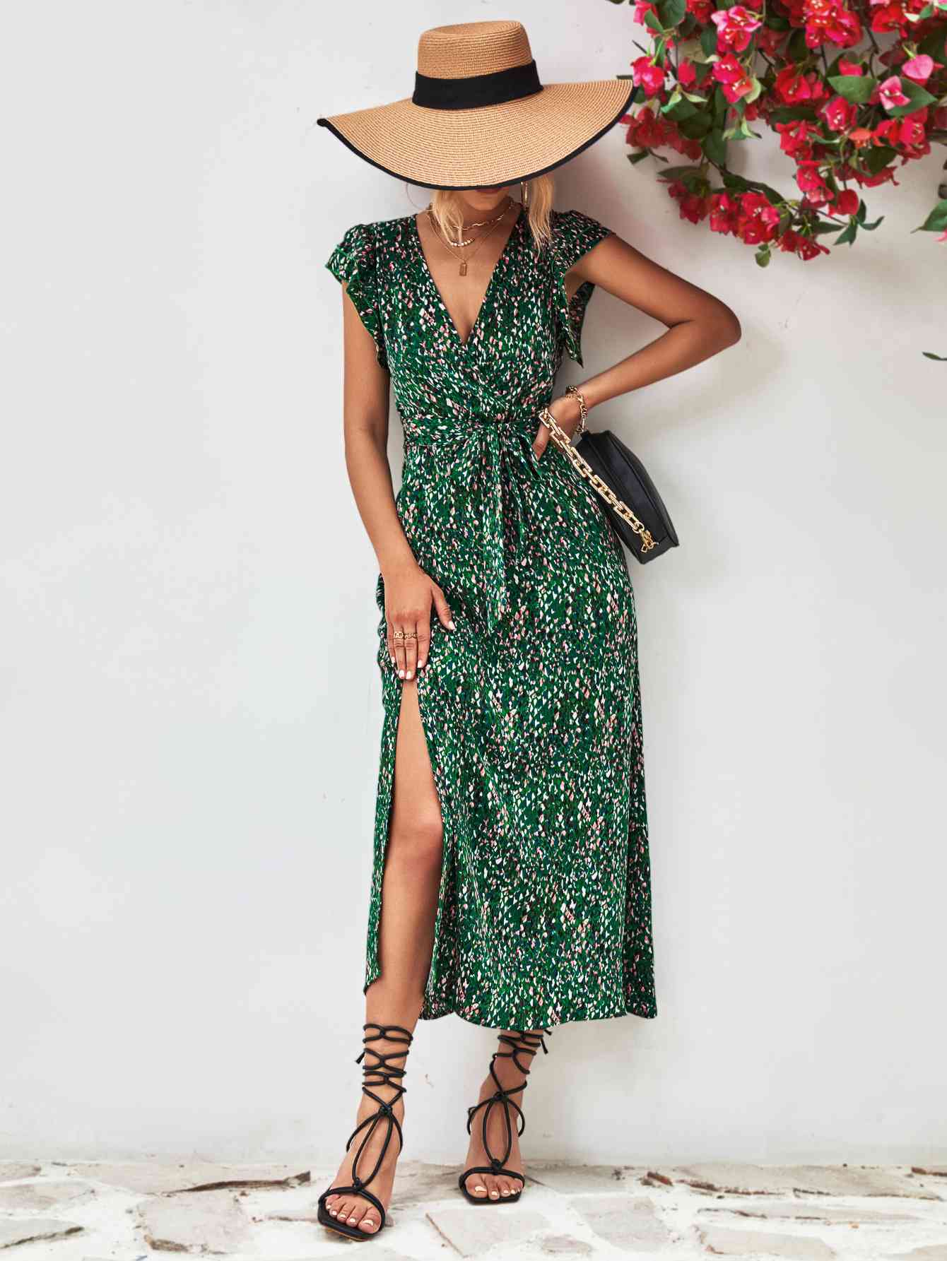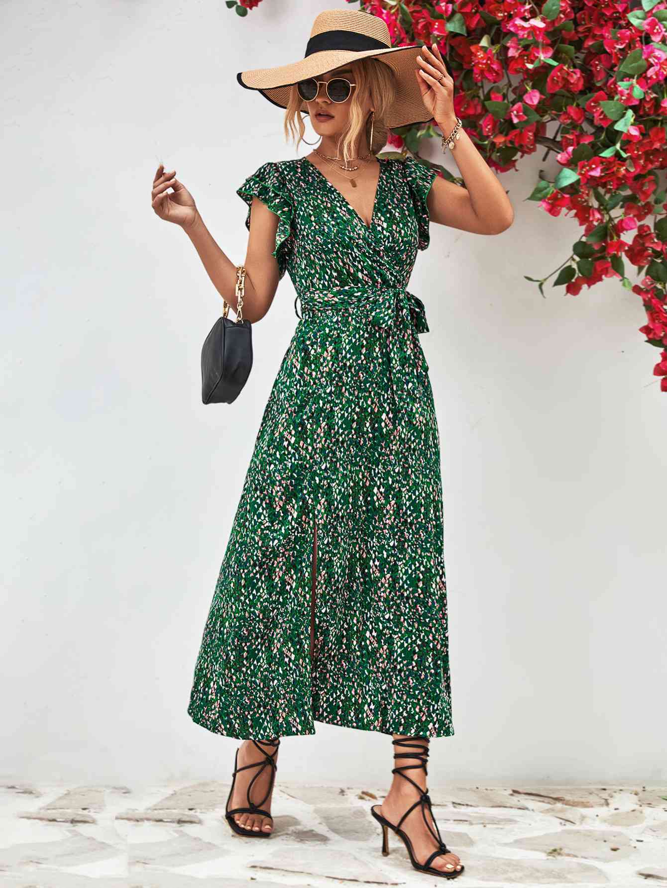 Printed Surplice Neck Flutter Sleeve Slit Dress