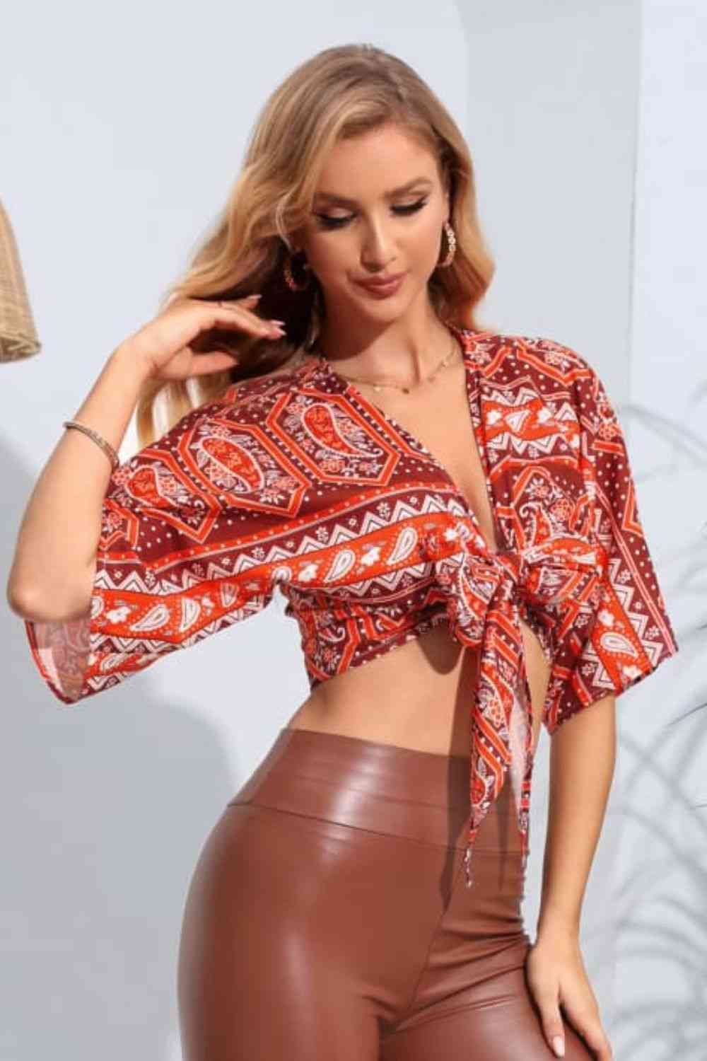 Printed Tie Front Cropped Dolman Sleeve Blouse
