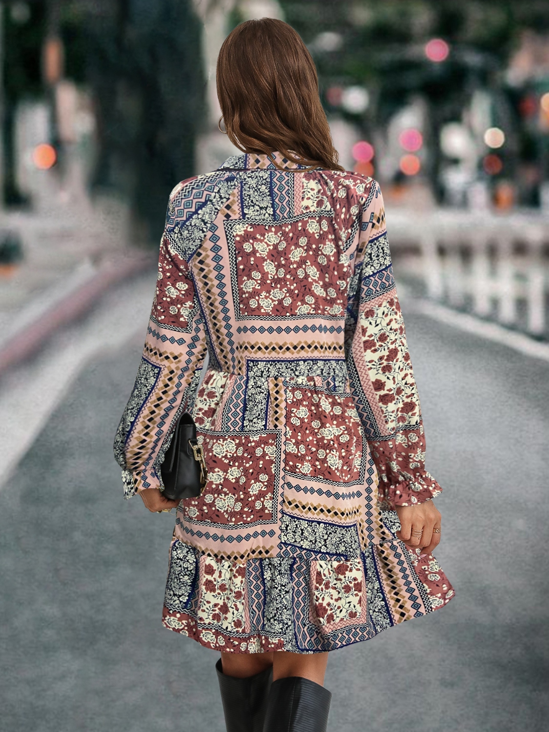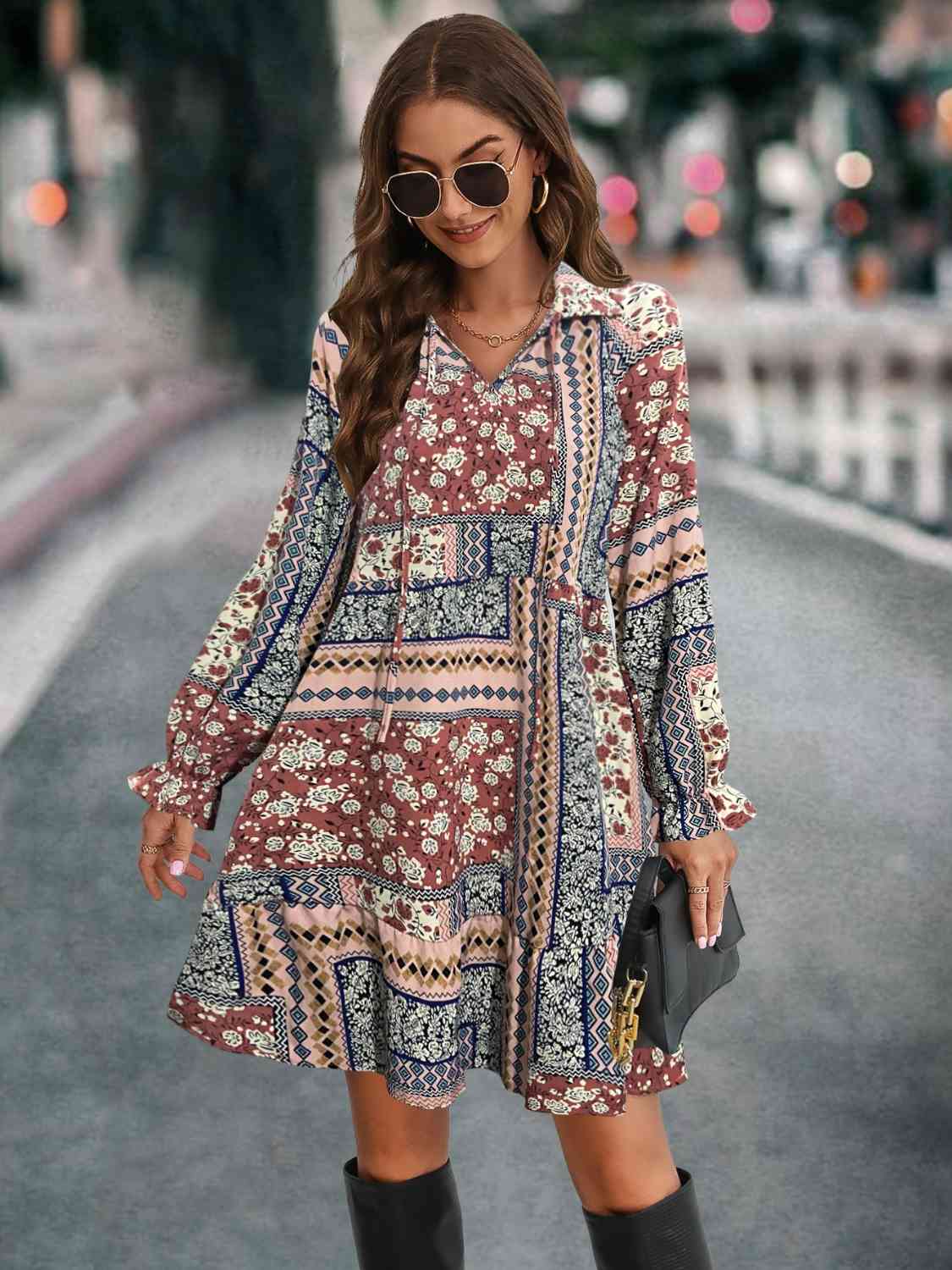 Printed Tie Front Flounce Sleeve Dress