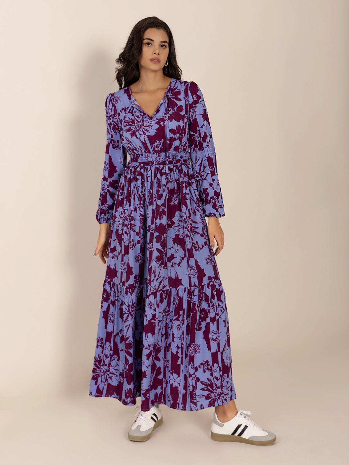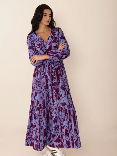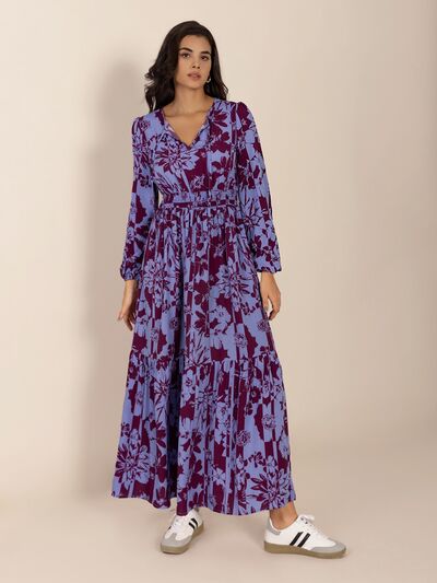Printed Tie Neck Balloon Sleeve Maxi Dress