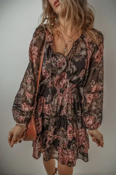 Printed Tie Neck Long Sleeve Mini Dress