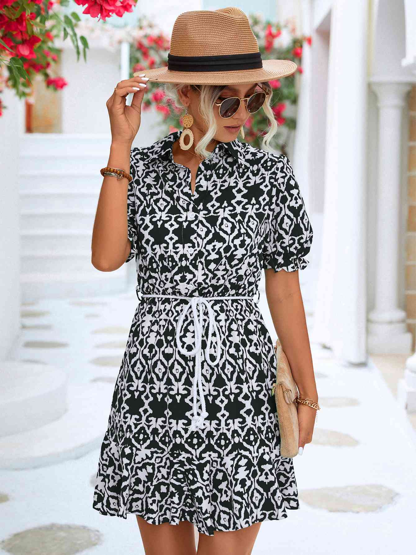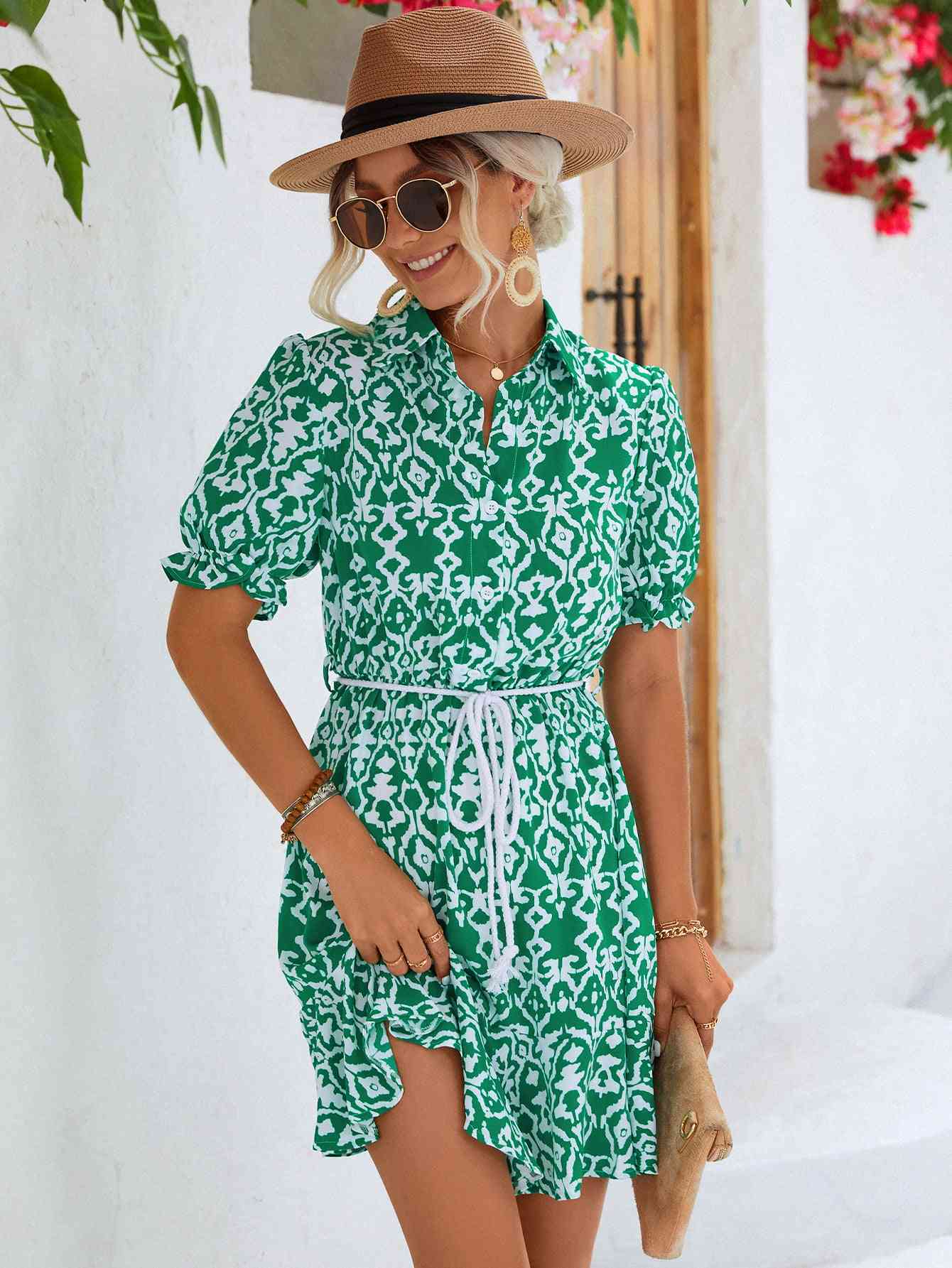 Printed Tie Waist Collared Flounce Sleeve Dress