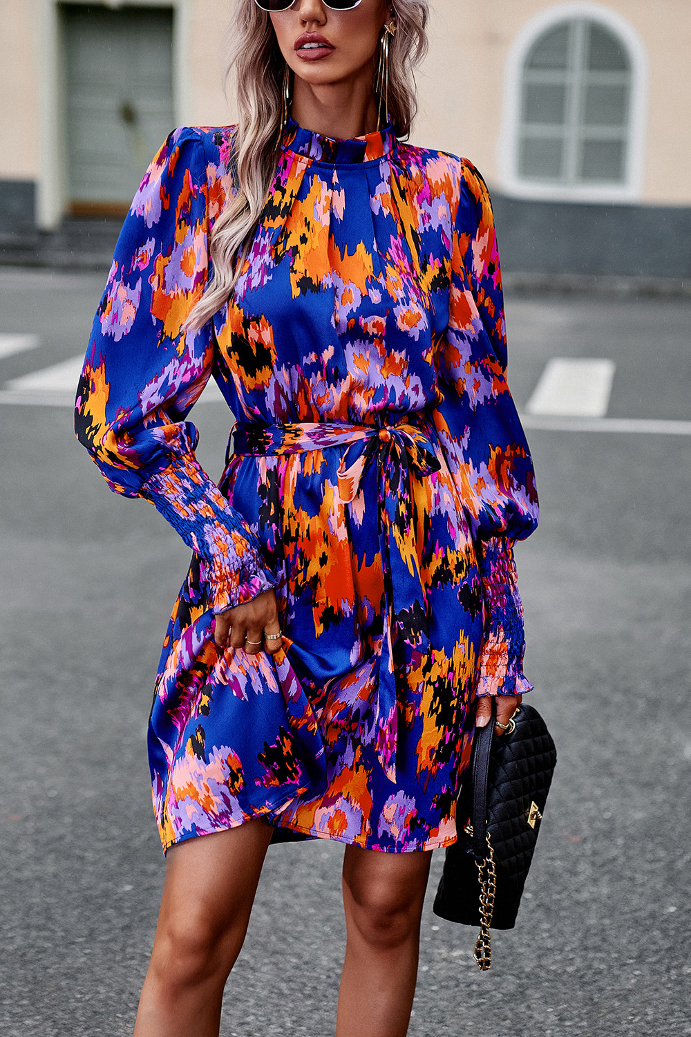 Printed Tie Waist Mock Neck Lantern Sleeve Dress
