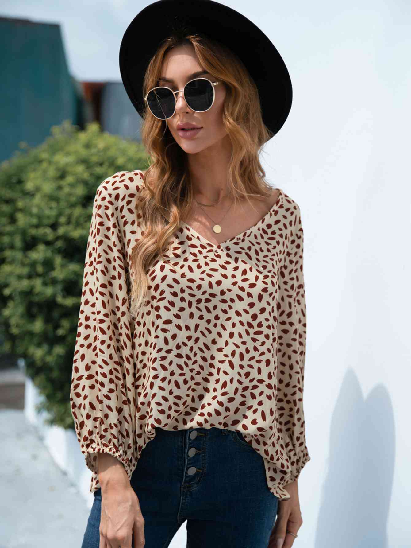 Printed V-Neck Balloon Sleeve Blouse