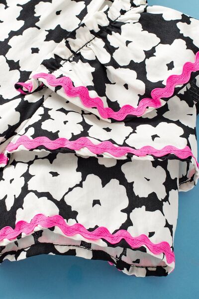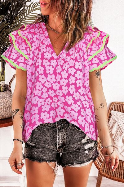 Printed V-Neck Flounce Sleeve Blouse