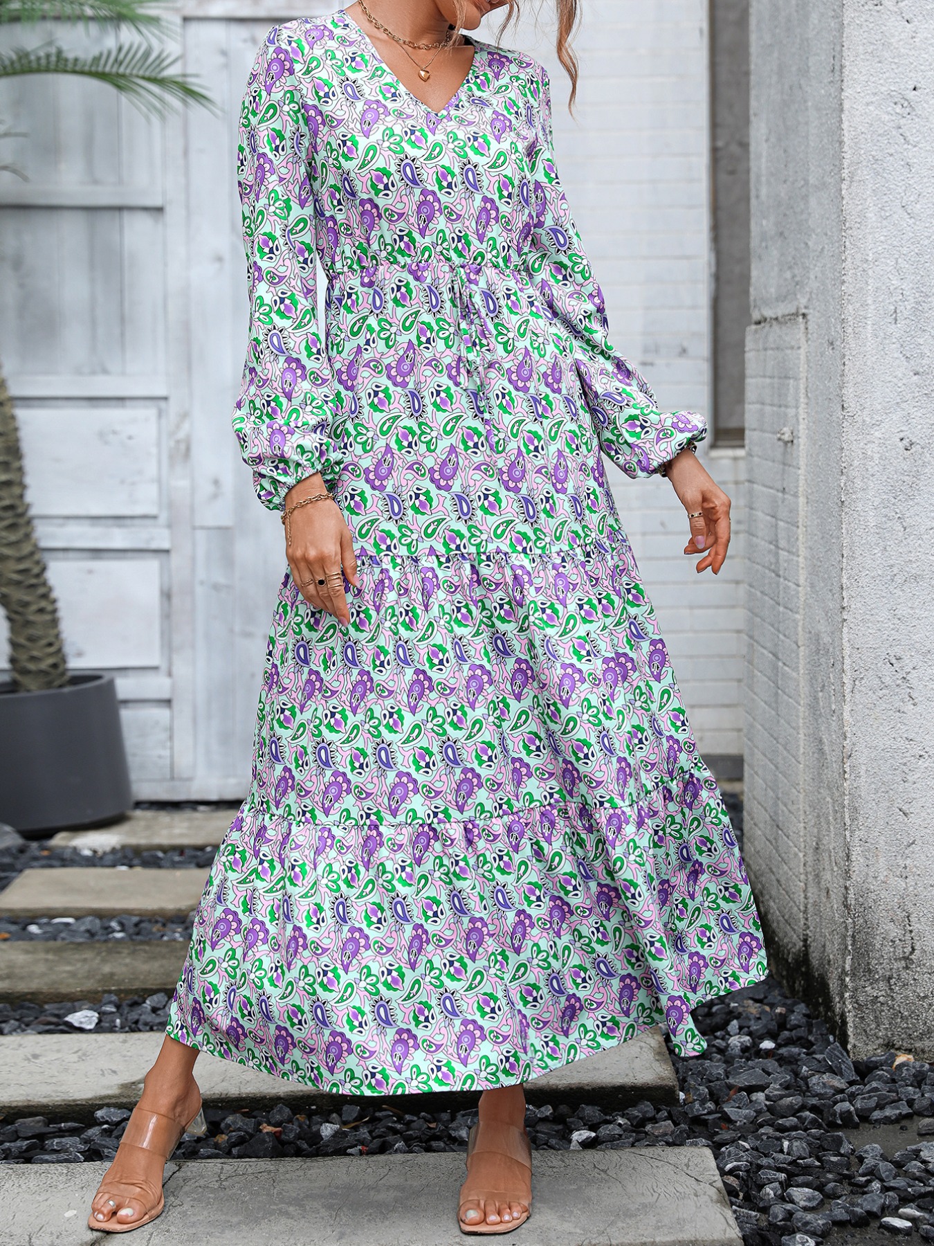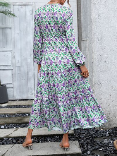 Printed V-Neck Long Sleeve Dress