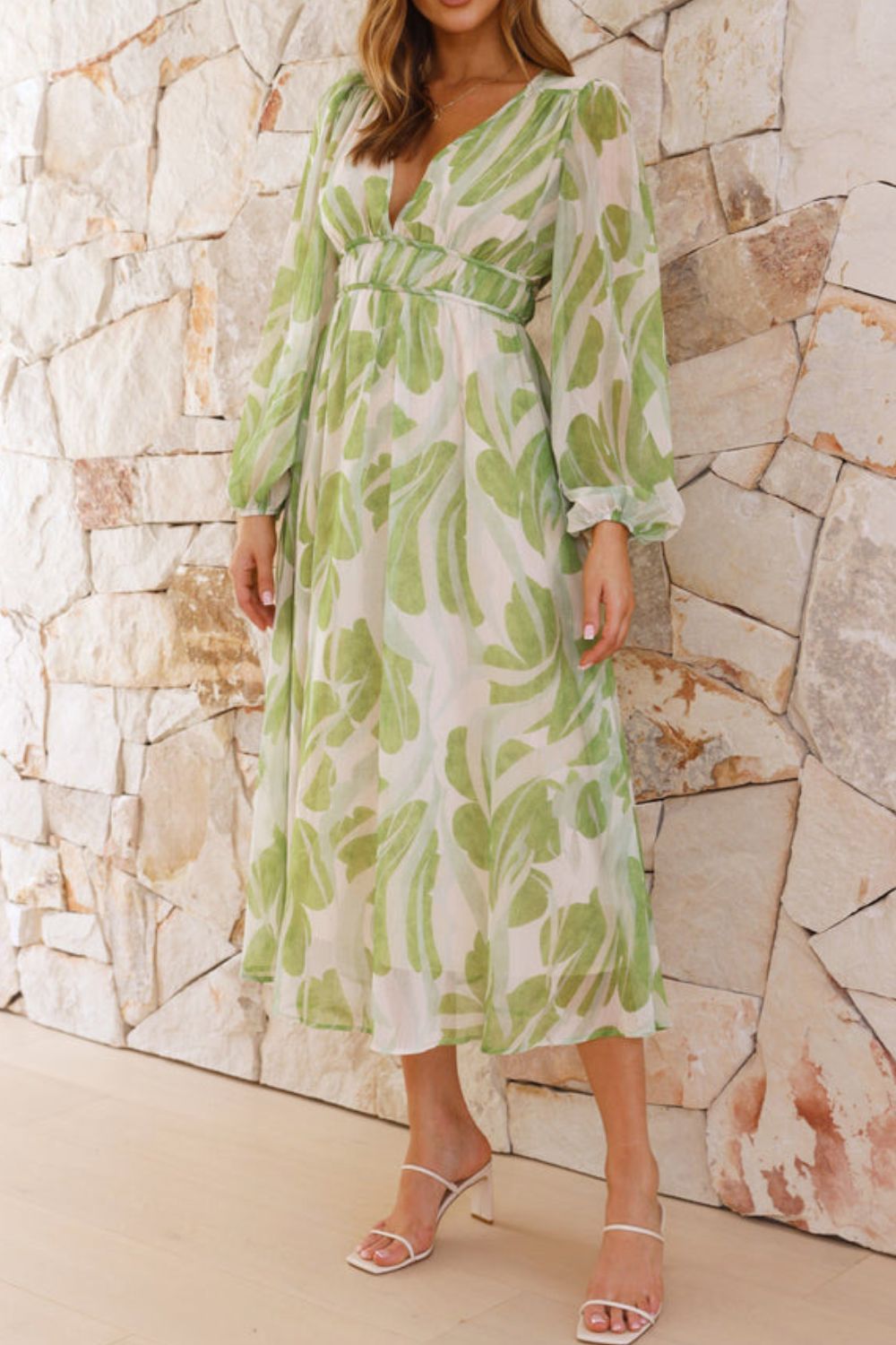 Printed V-Neck Long Sleeve Midi Dress
