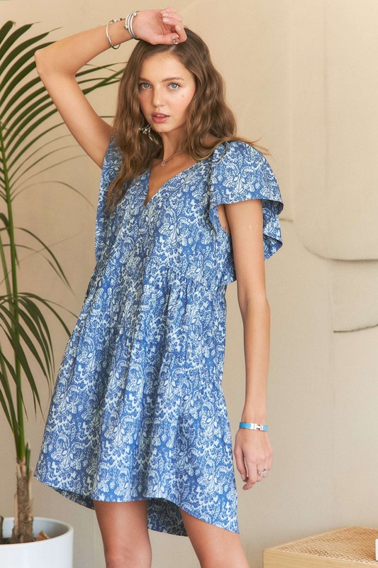 Printed V-Neck Ruffle Sleeve Mini Dress