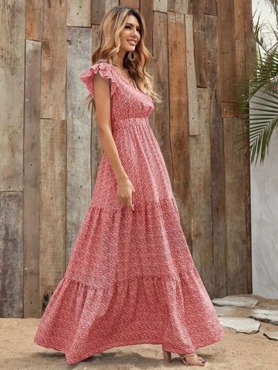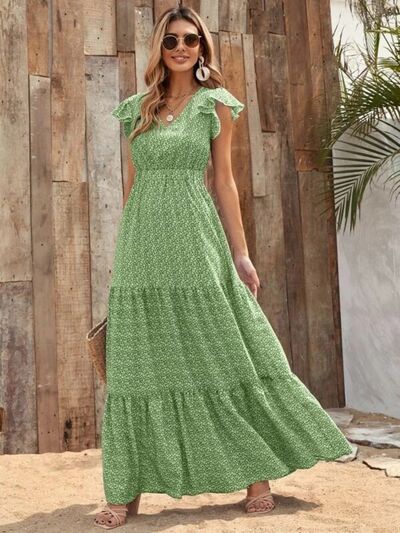 Printed V-Neck Ruffled Cap Sleeve Maxi Dress