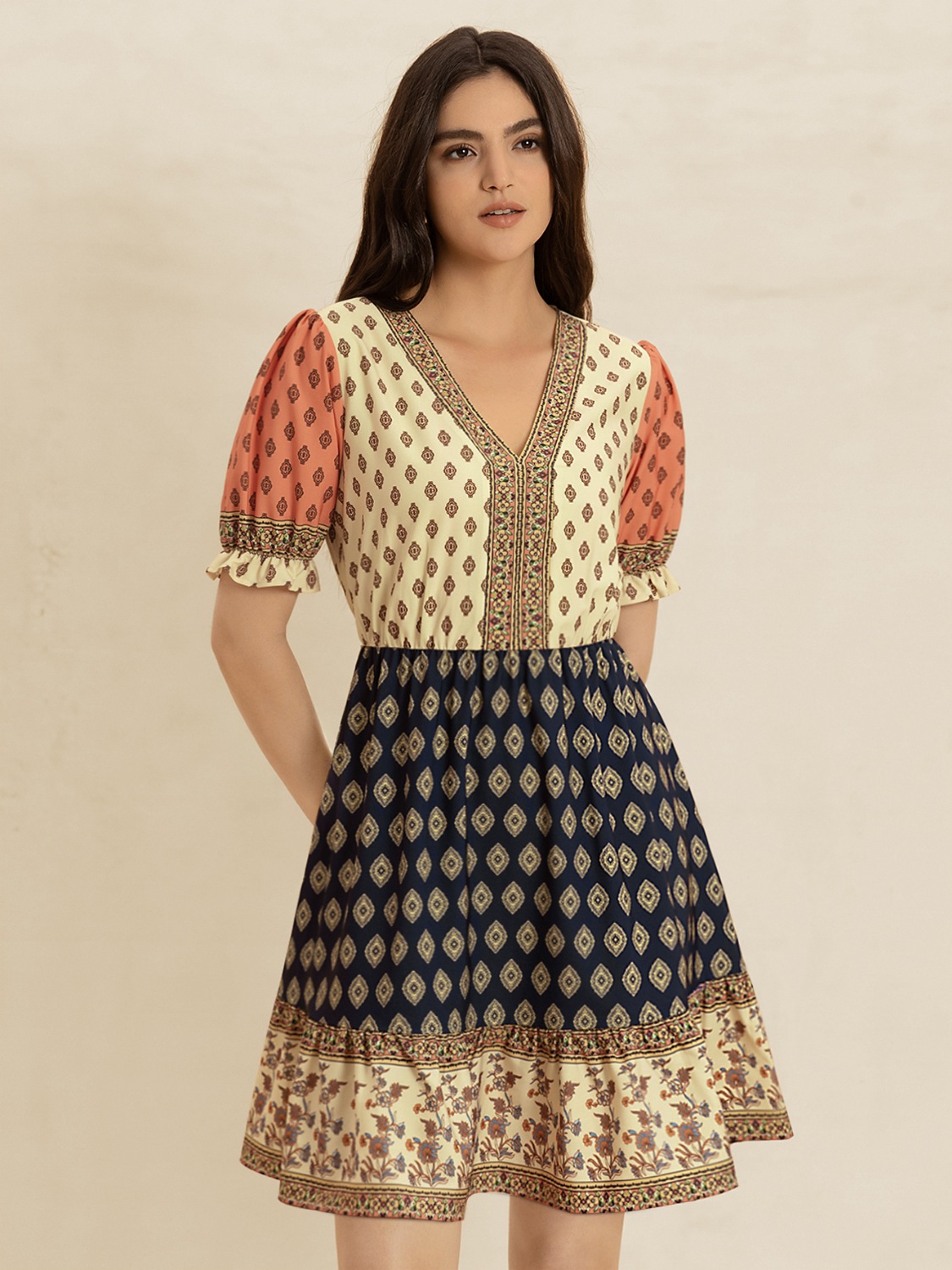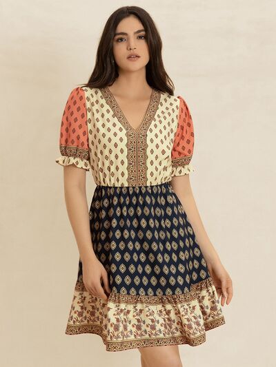 Printed V-Neck Short Sleeve Dress