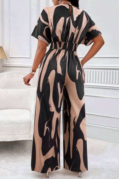 Printed V-Neck Short Sleeve Wide Leg Jumpsuit