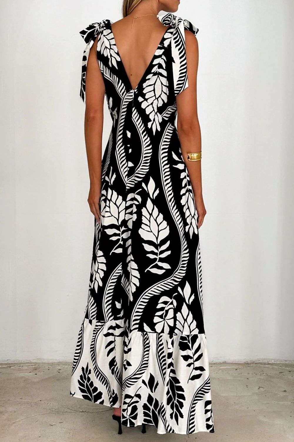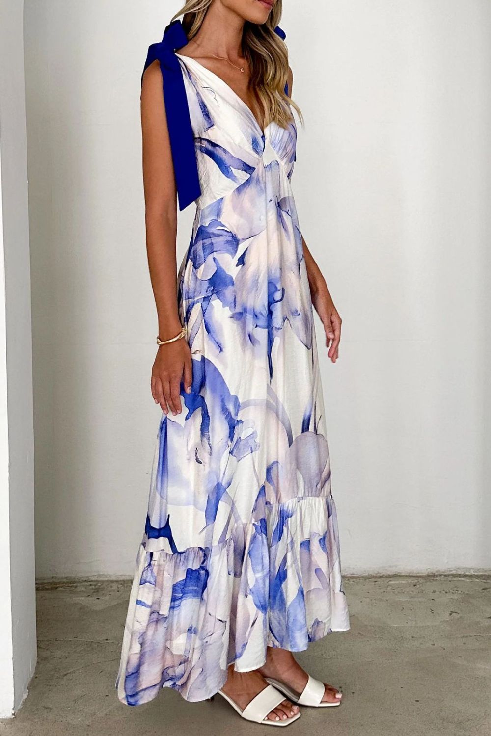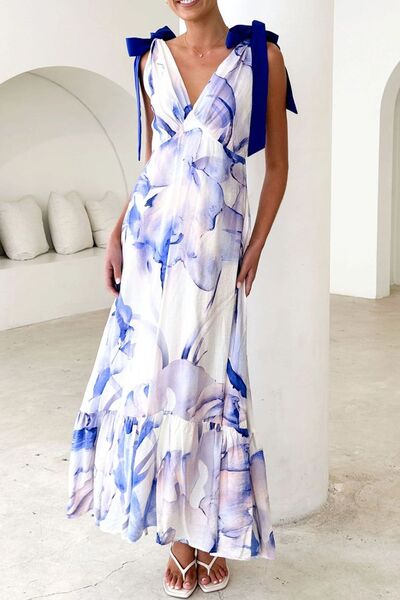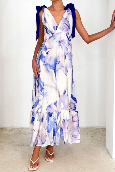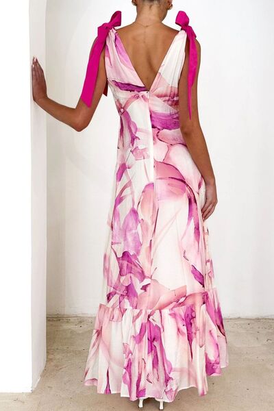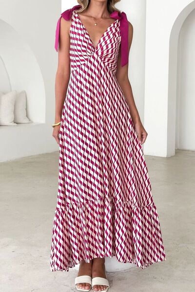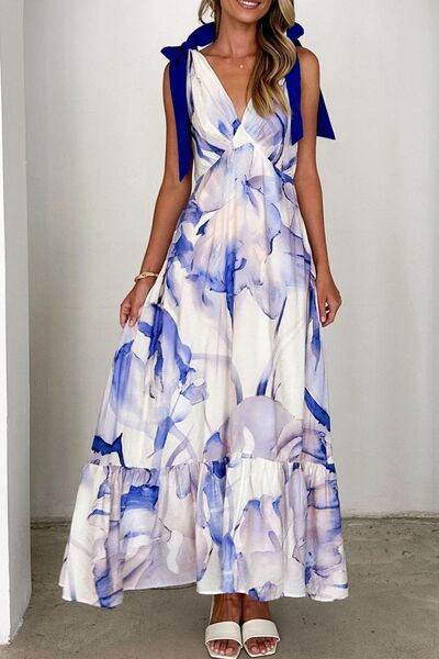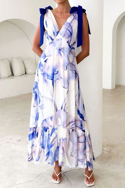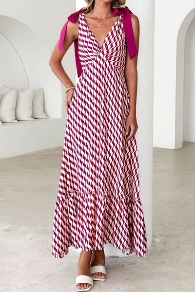 Printed V-Neck Tie Shoulder Midi Cami Dress