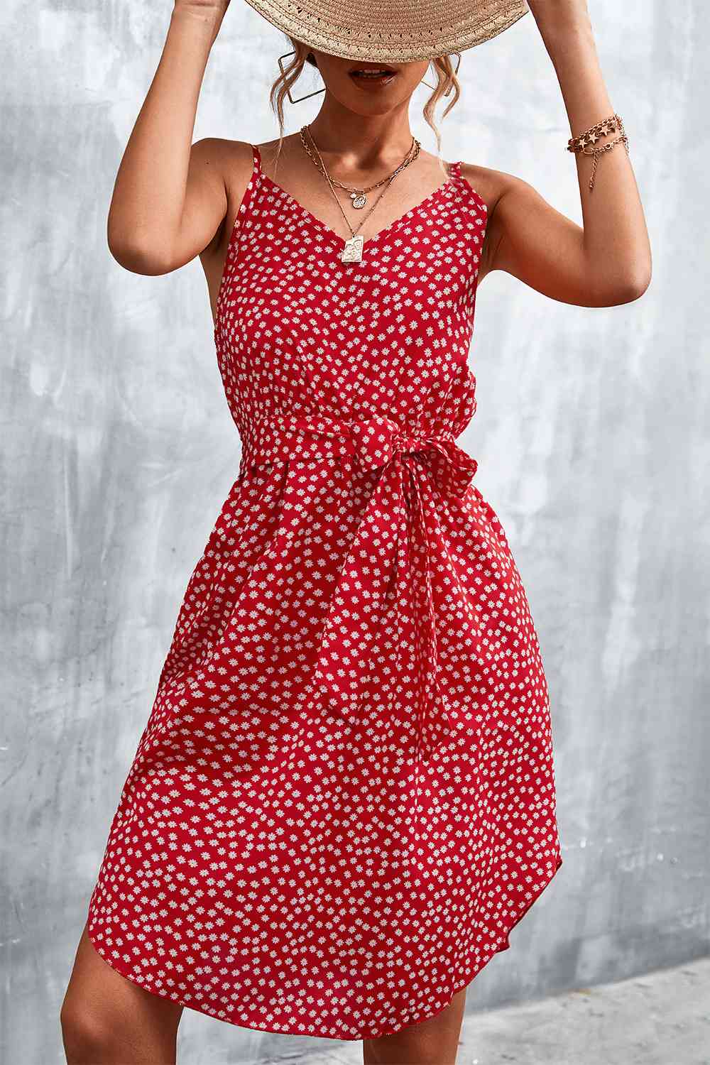 Printed V-Neck Tie Waist Mini Dress