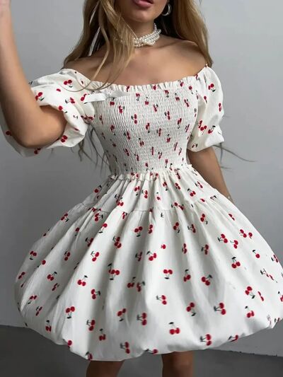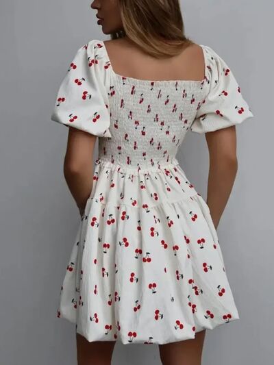 Puff Sleeve Cherry Print Smocked Mini Dress
