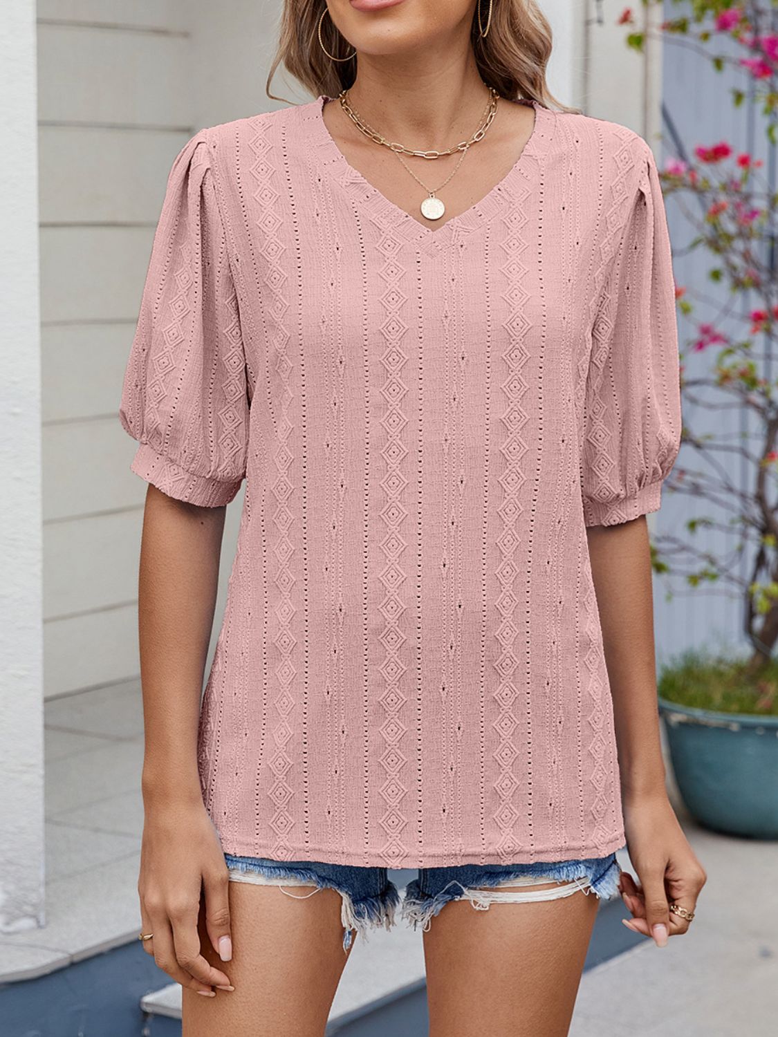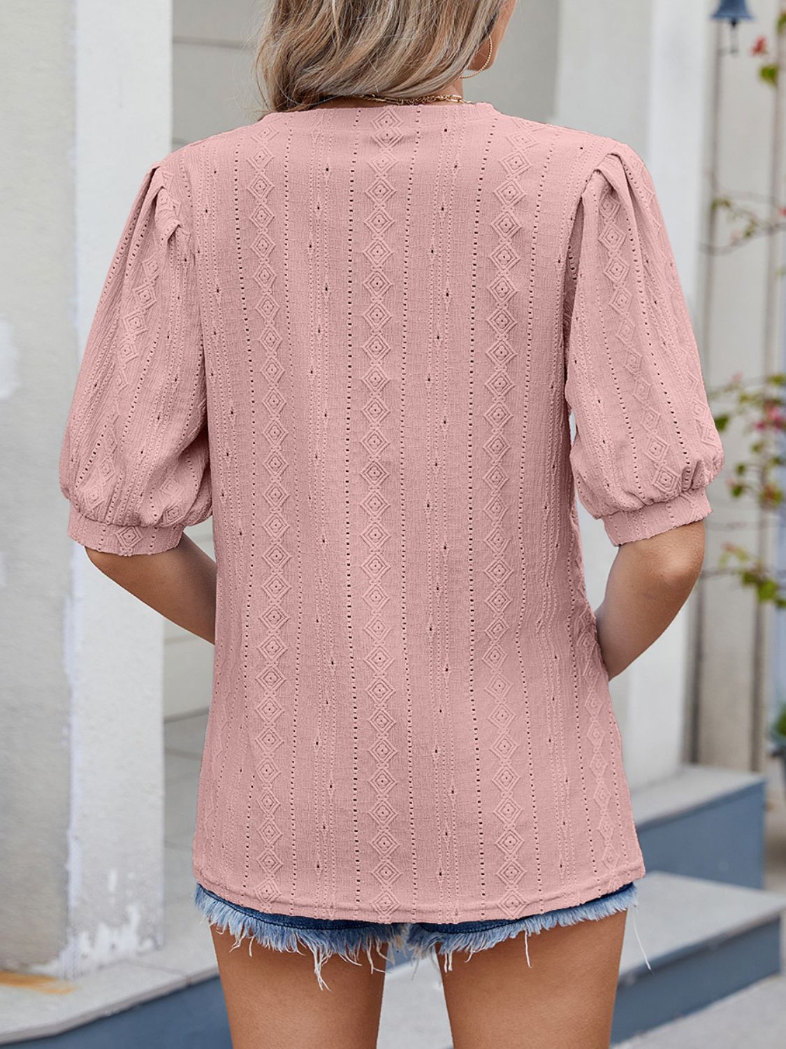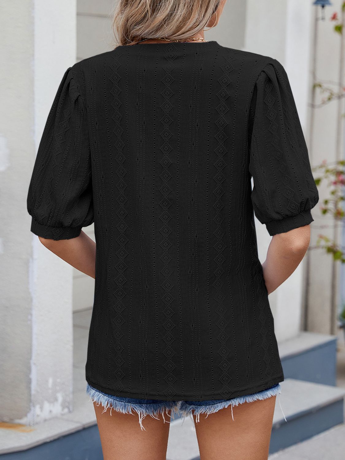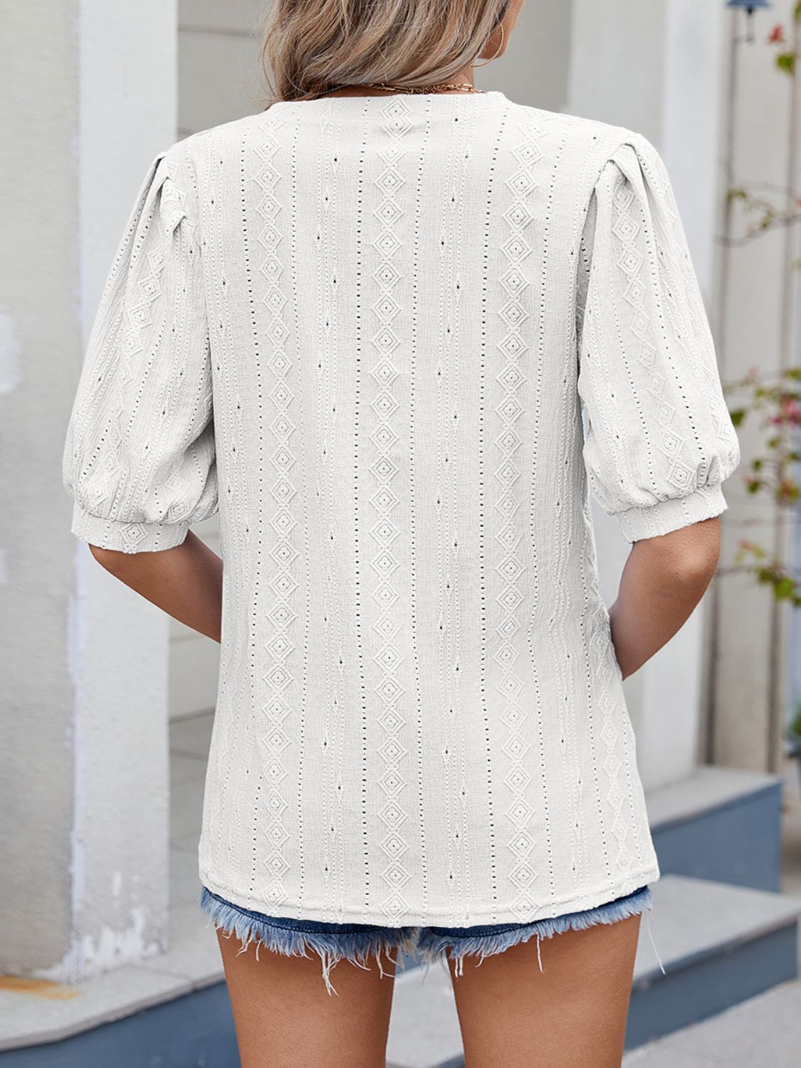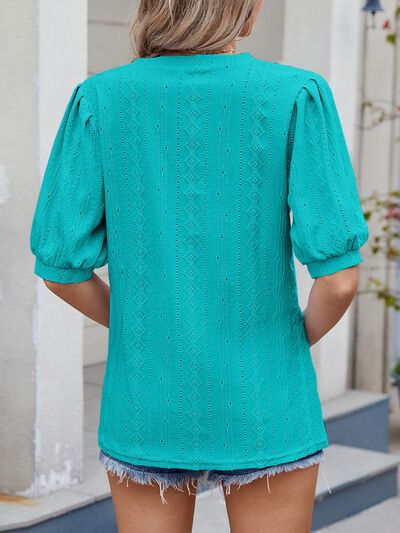 Puff Sleeve V-Neck Eyelet Lace T-Shirt