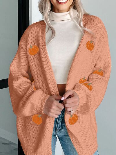 Pumpkin Tree Print Open Front Drop Shoulder Midi Cardigan