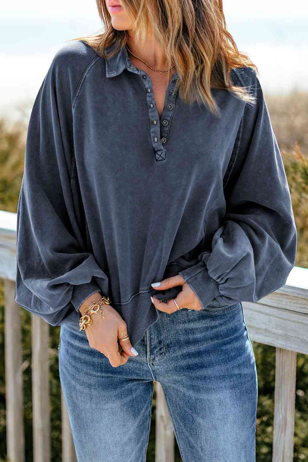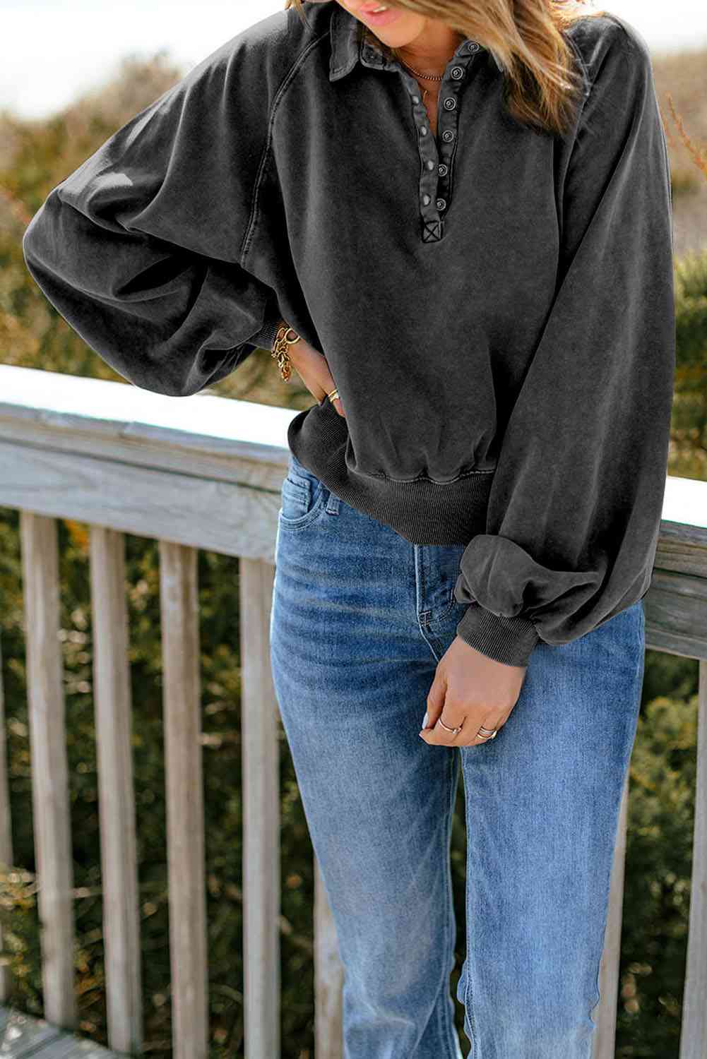 Quarter-Snap Collared Lantern Sleeve Sweatshirt