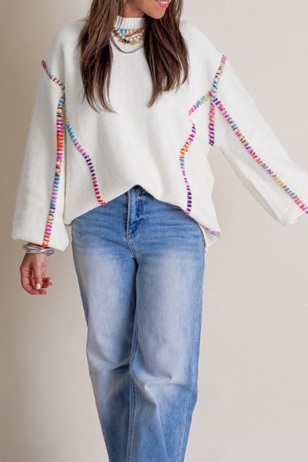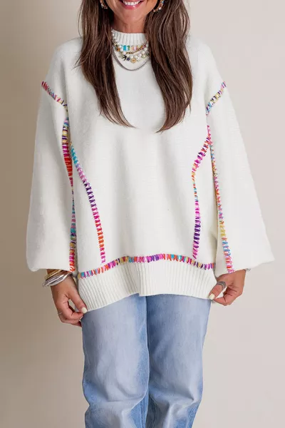Rainbow Stitching Long Sleeve Relaxed Sweater