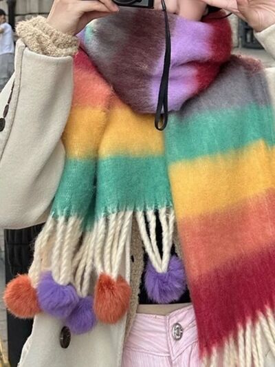 Rainbow Striped Fuzzy Scarf with Pom-Poms