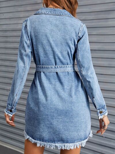 Raw Hem Collared Neck Long Sleeve Denim Dress