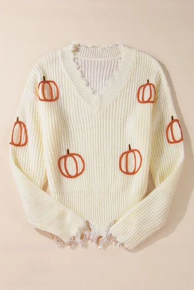 Raw Hem Pumpkin V-Neck Long Sleeve Sweater