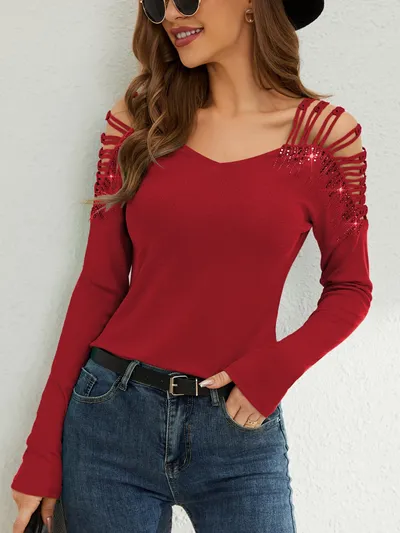 Rhinestone Cutout Long Sleeve T-Shirt
