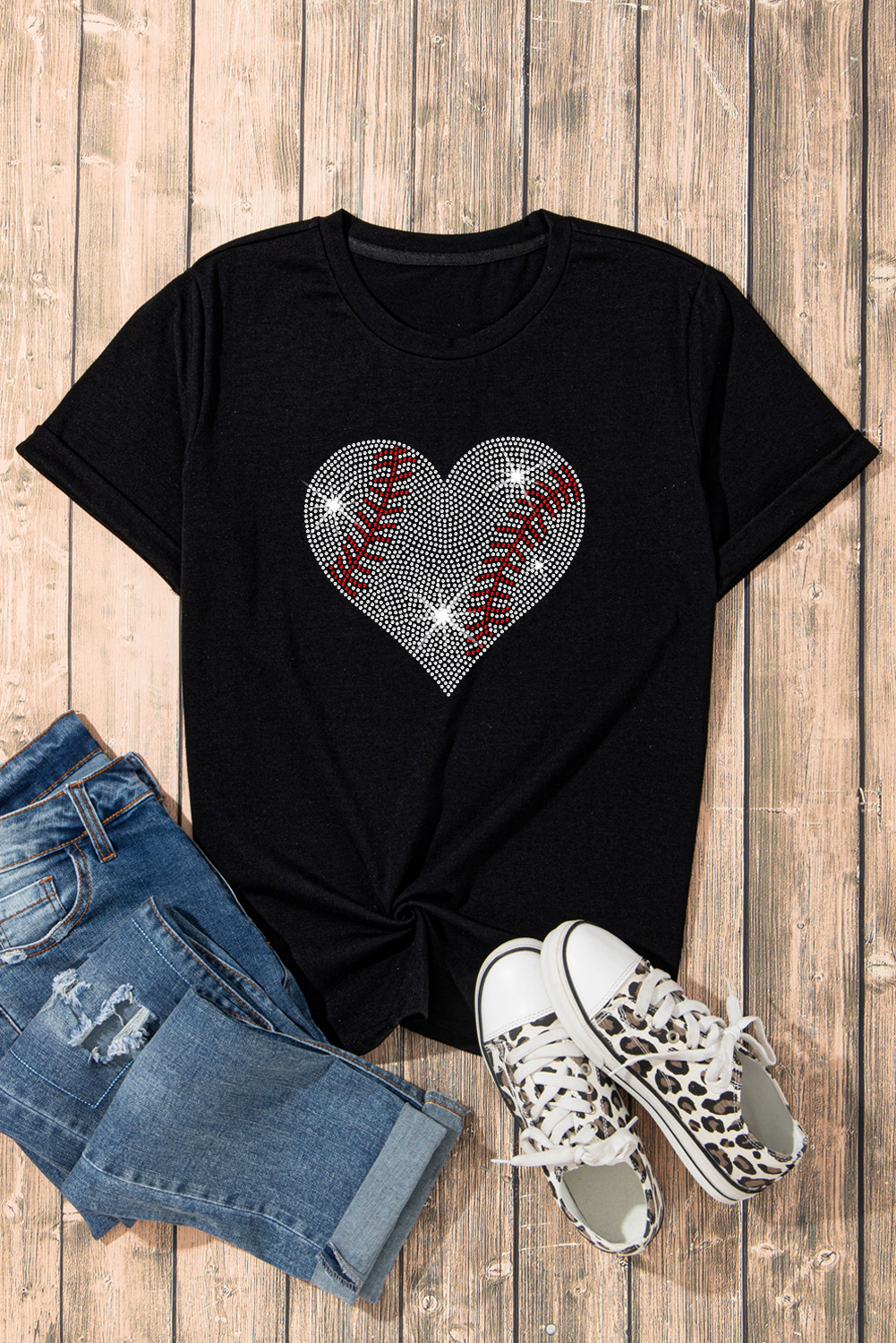 Rhinestone Heart Round Neck Short Sleeve T-Shirt