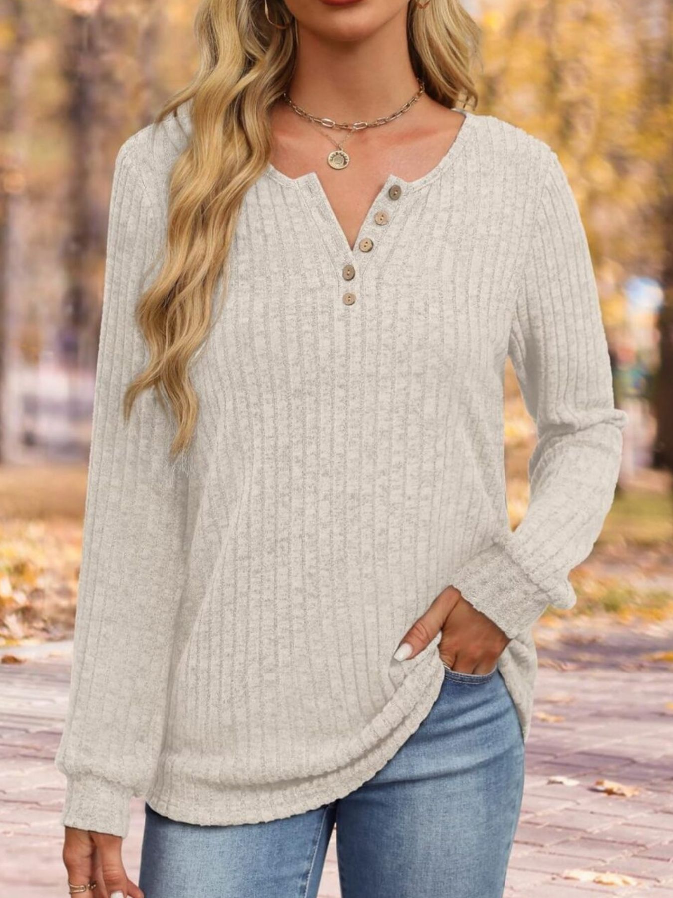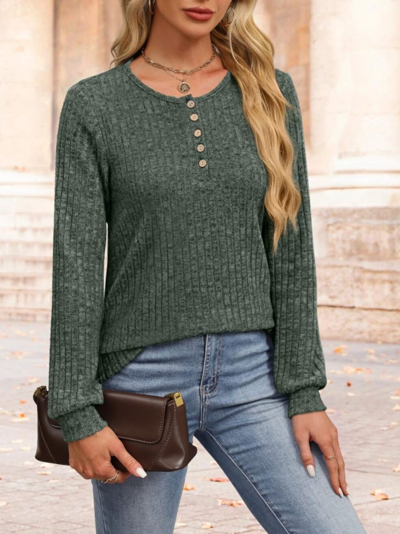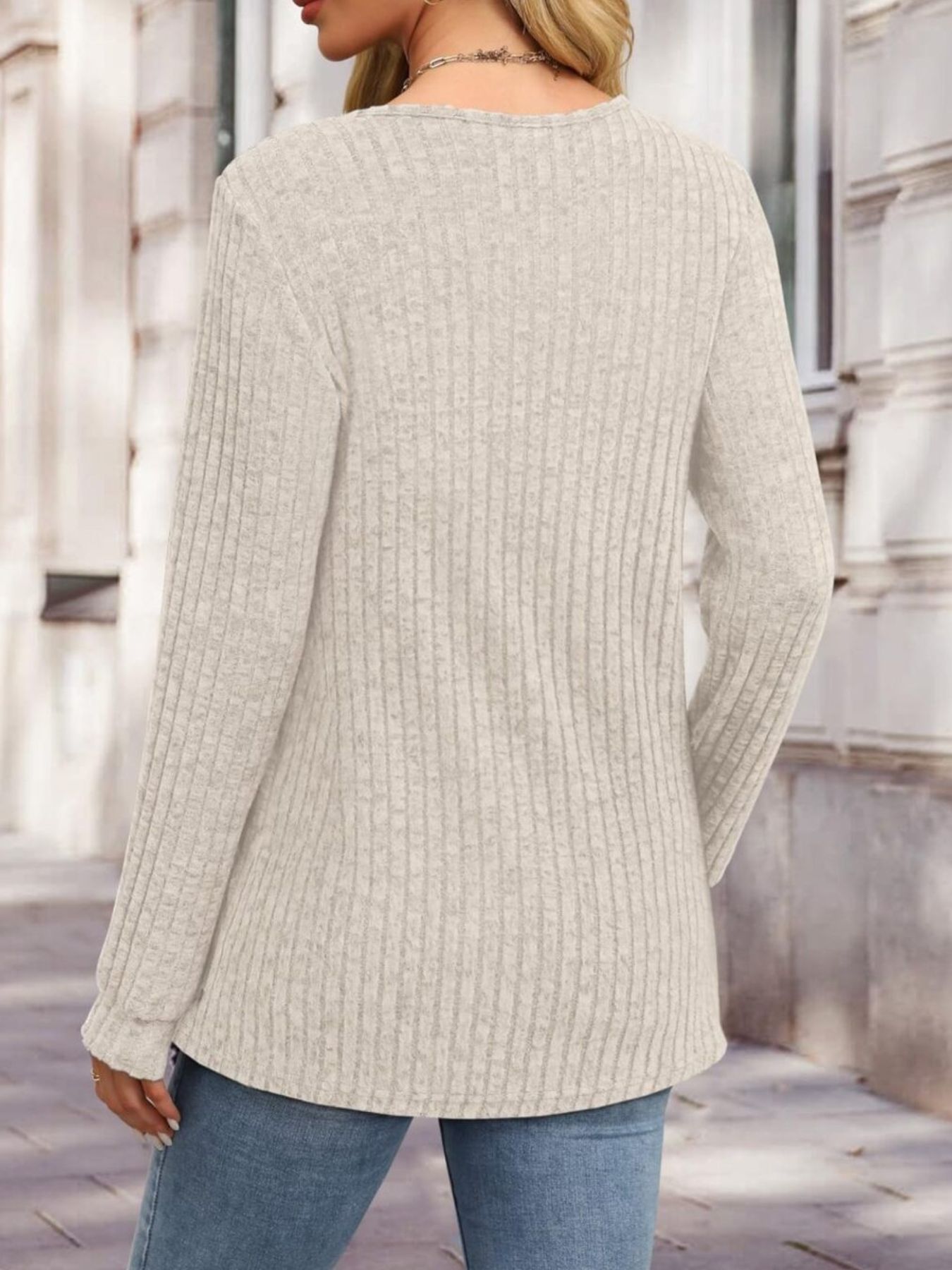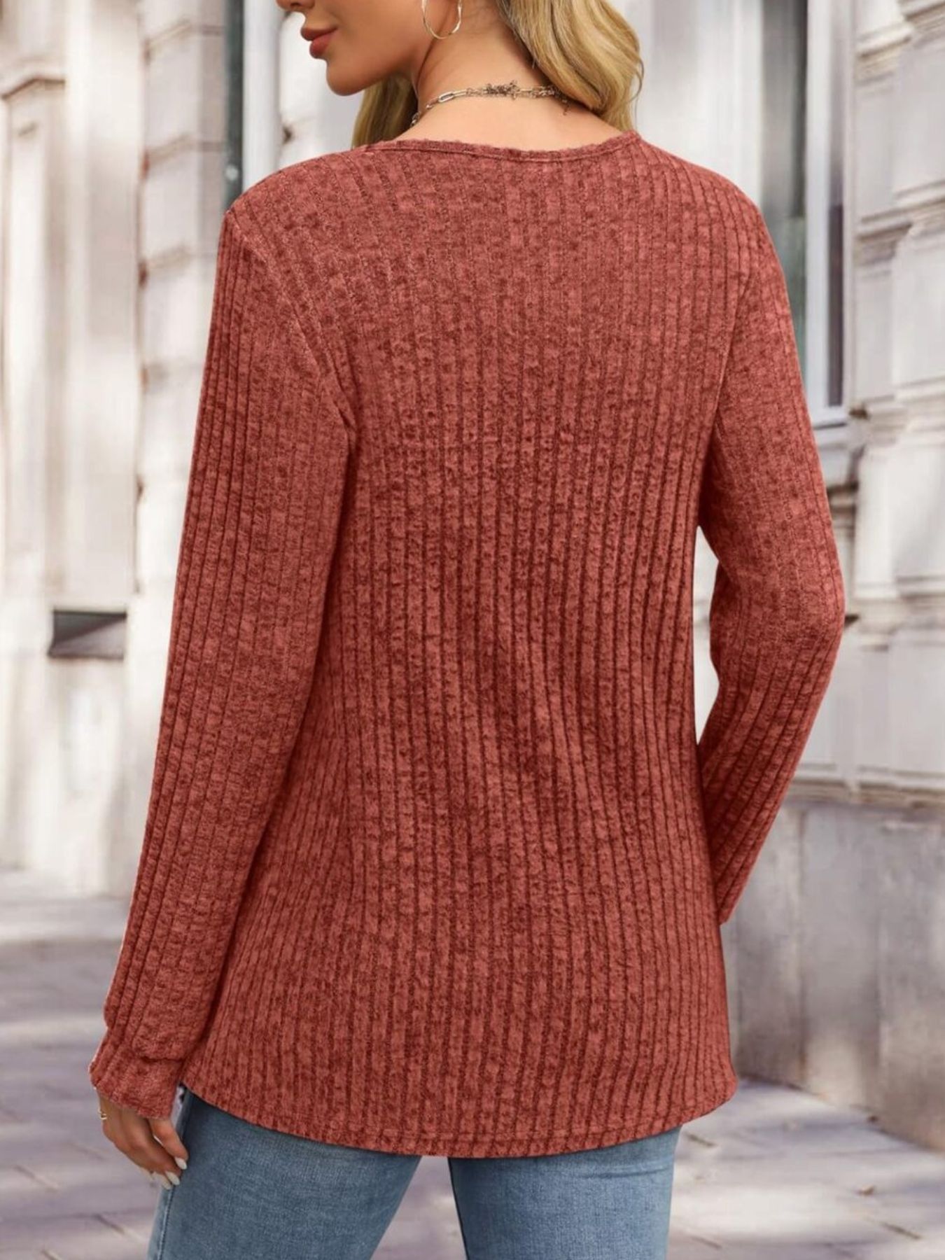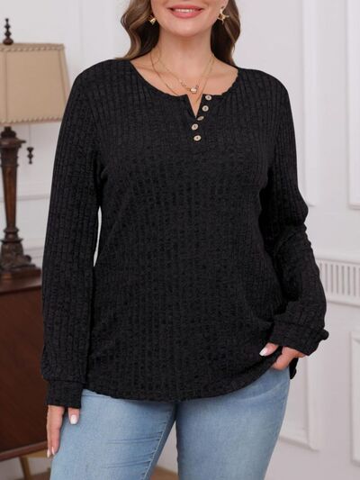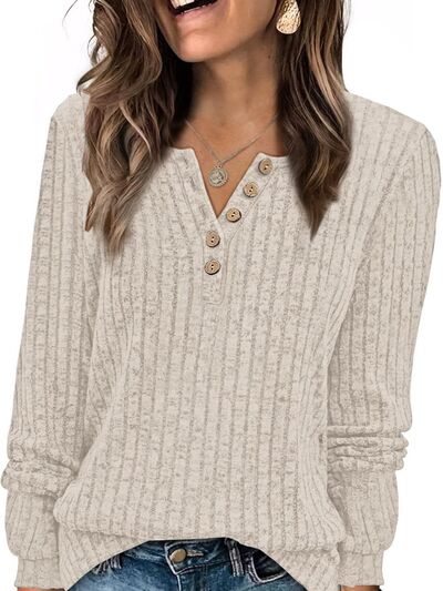 Ribbed Knit Button-Front Long Sleeve T-Shirt