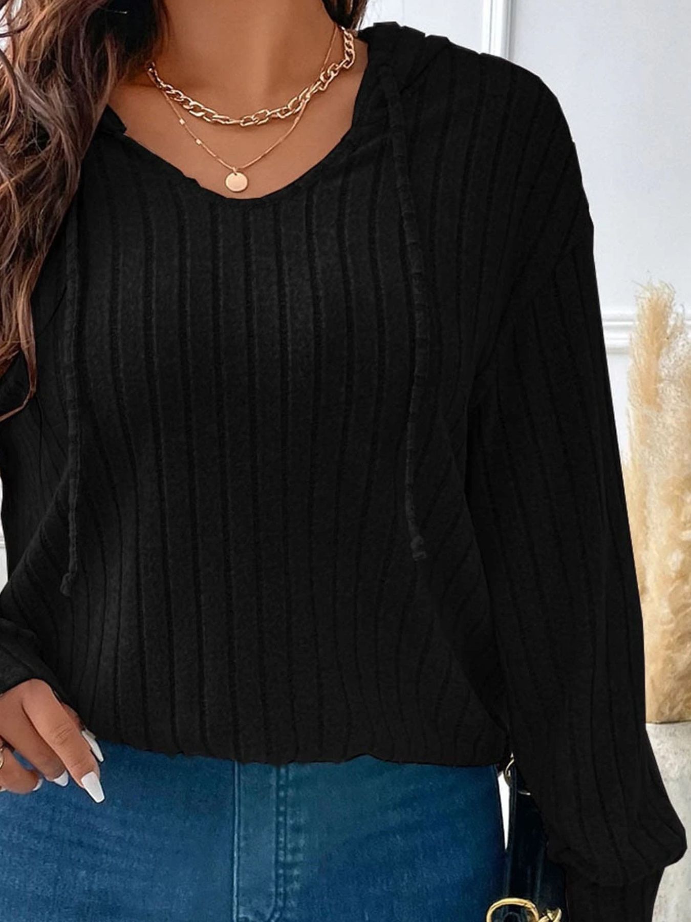 Ribbed Knit Drawstring Hooded T-Shirt