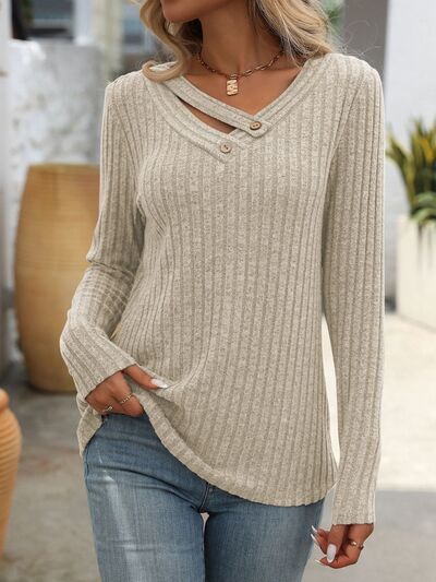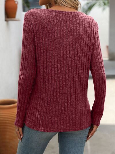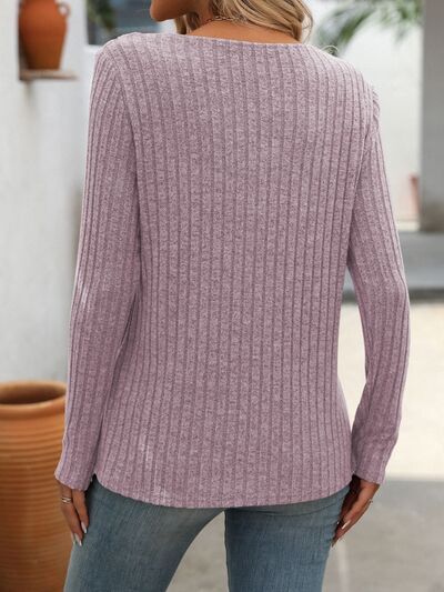 Ribbed Knit Long Sleeve Button Detail T-Shirt