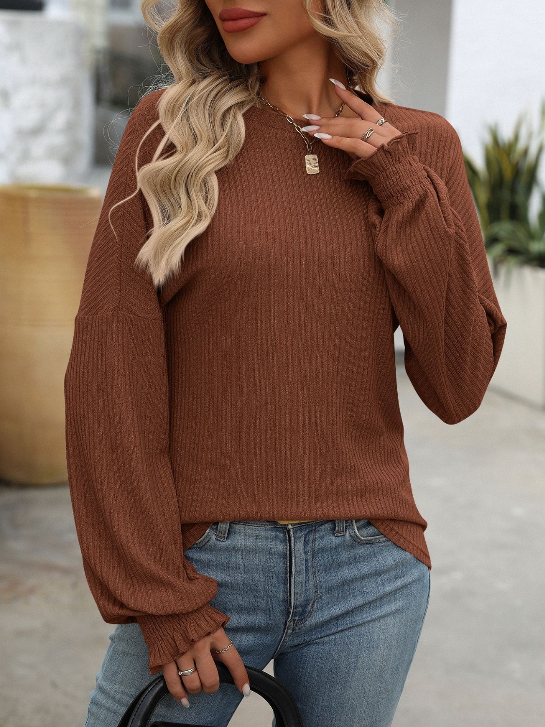 Ribbed Knit Ruffle Cuff T-Shirt