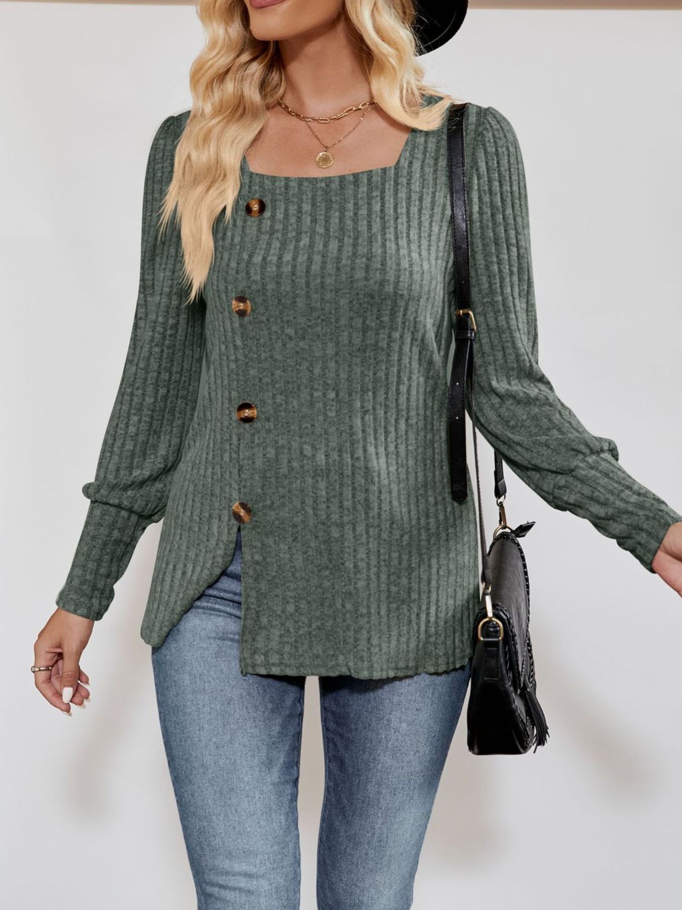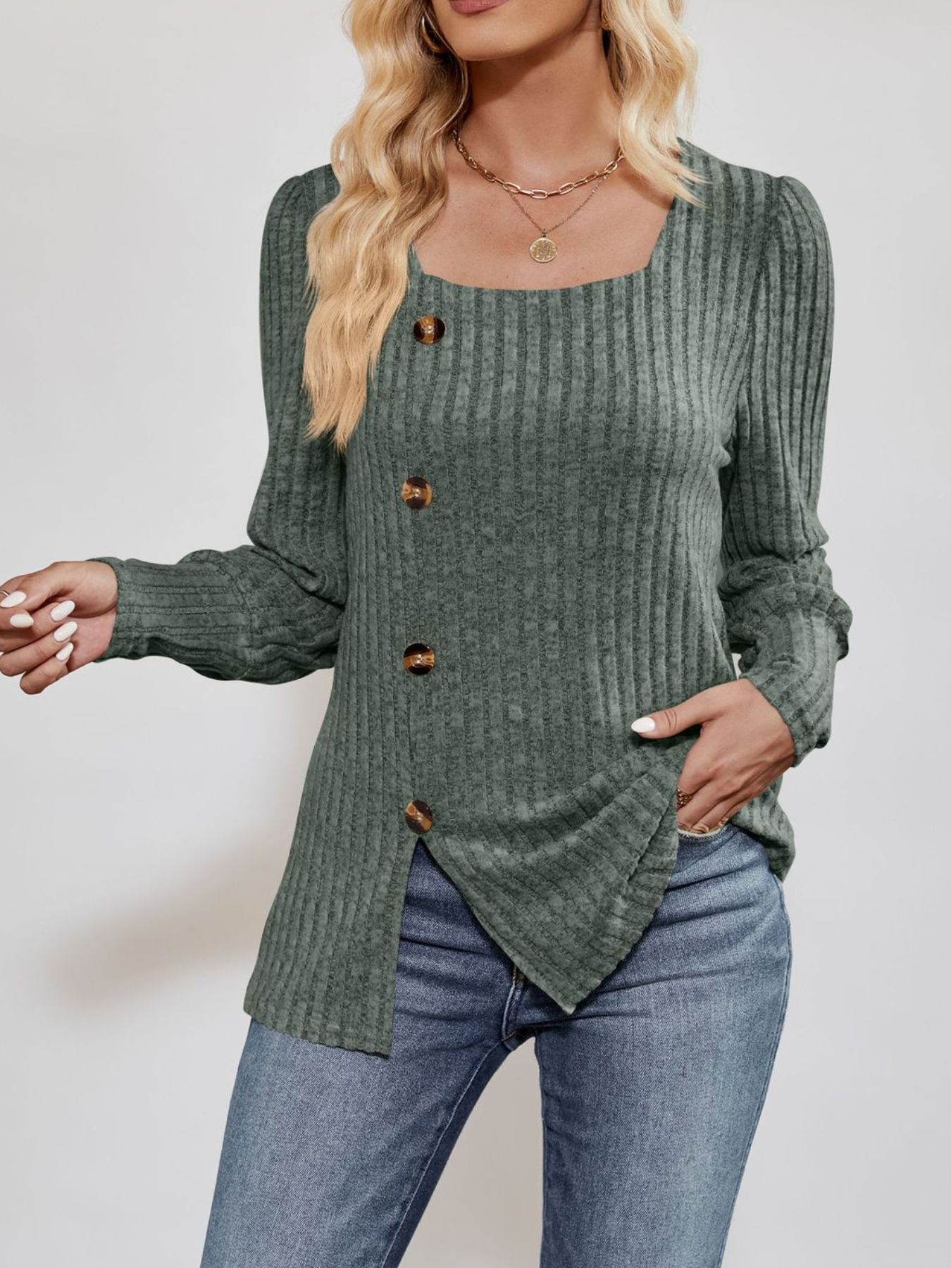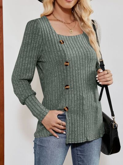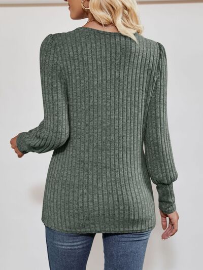 Ribbed Knit Slit Long Sleeve T-Shirt