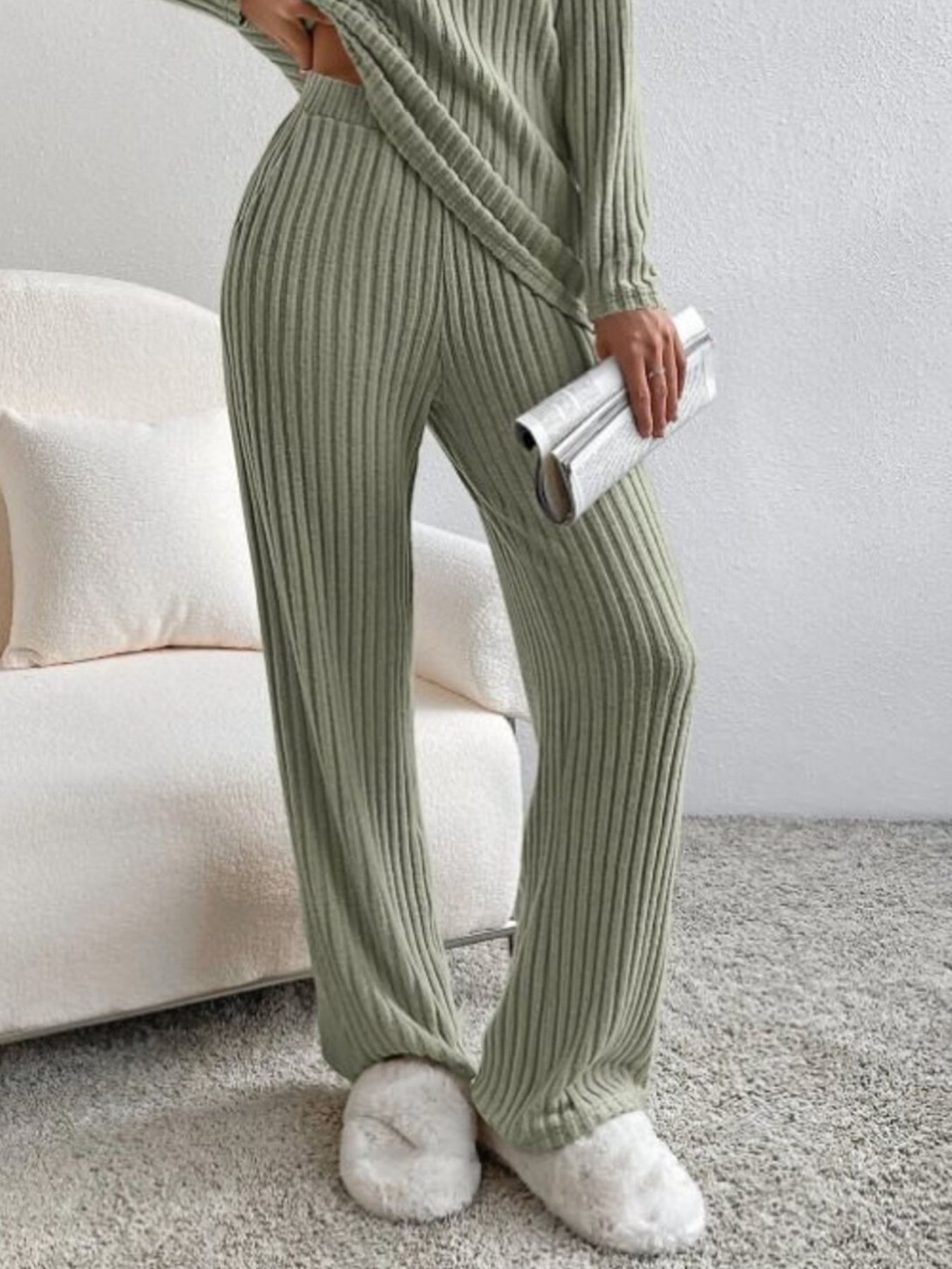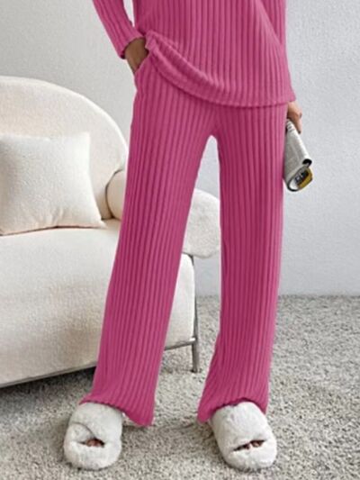 Ribbed Knit V-Neck Top and Pants Set