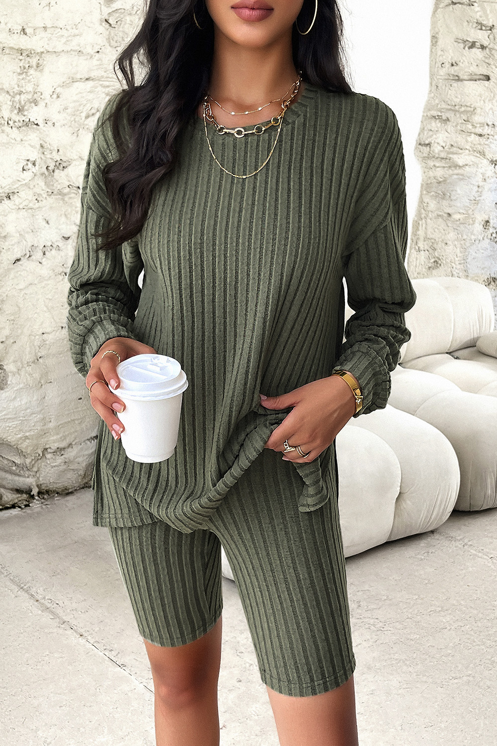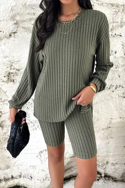 Ribbed Round Neck Dropped Shoulder Top and Shorts Set