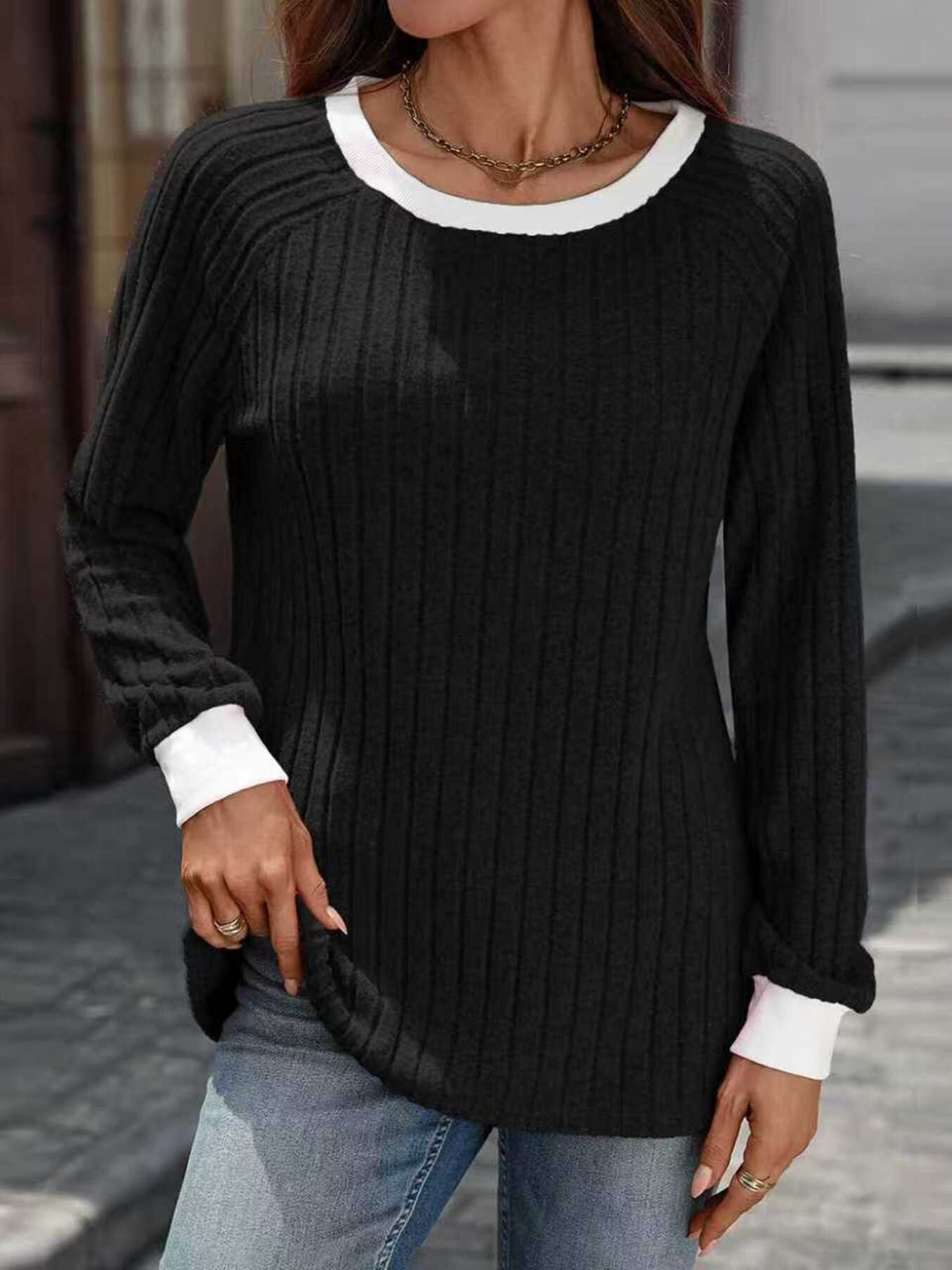 Ribbed Round Neck Raglan Sleeve Knit Top