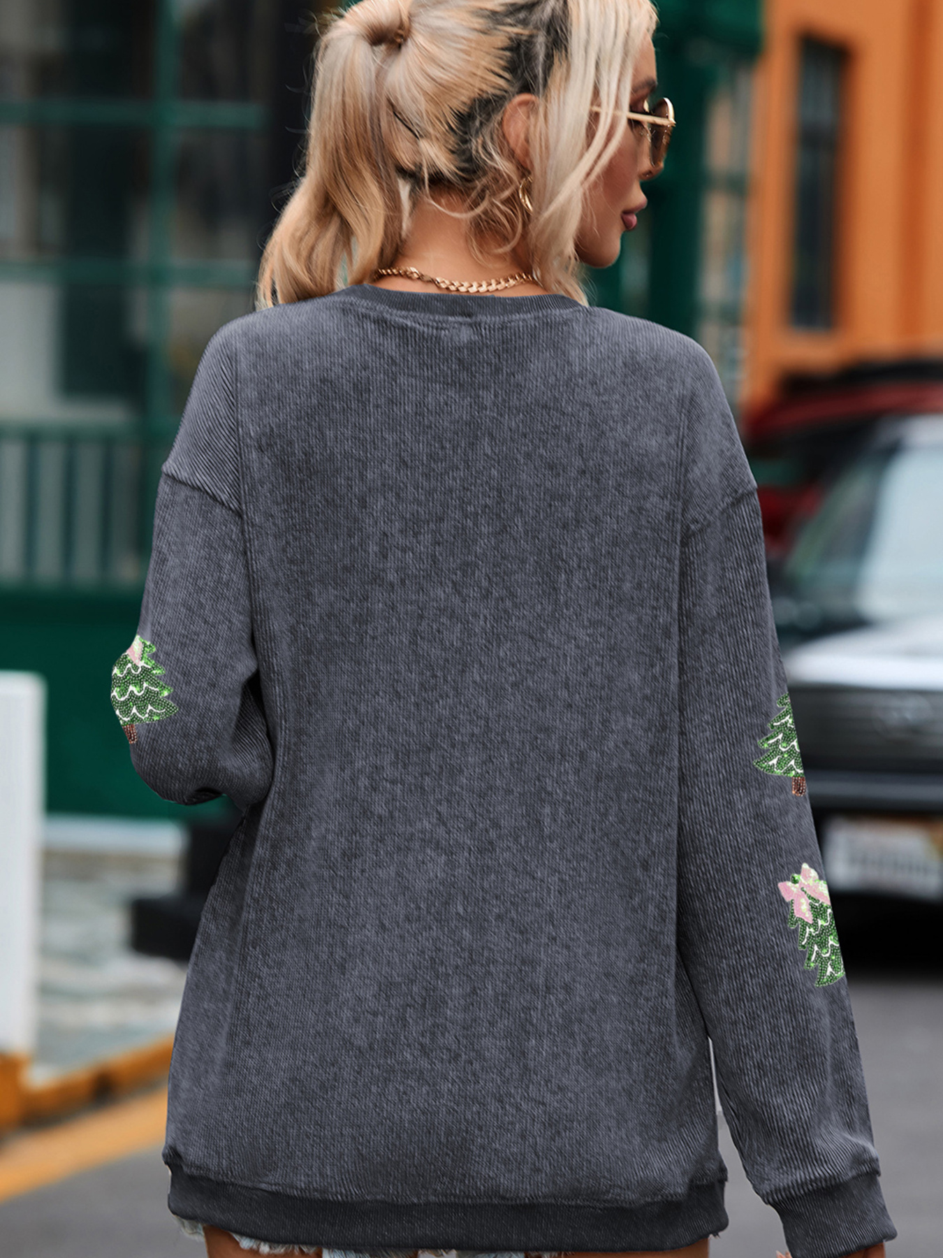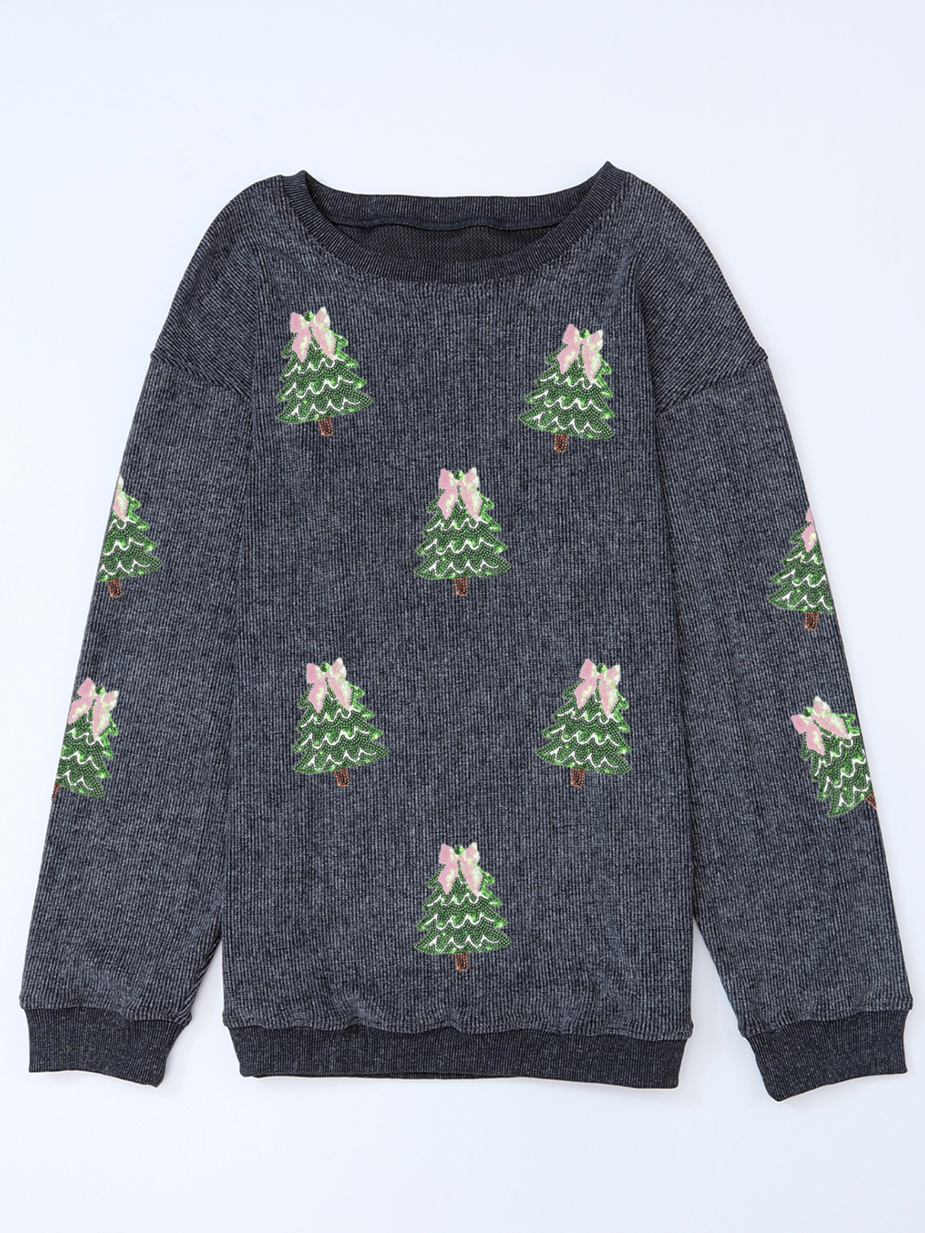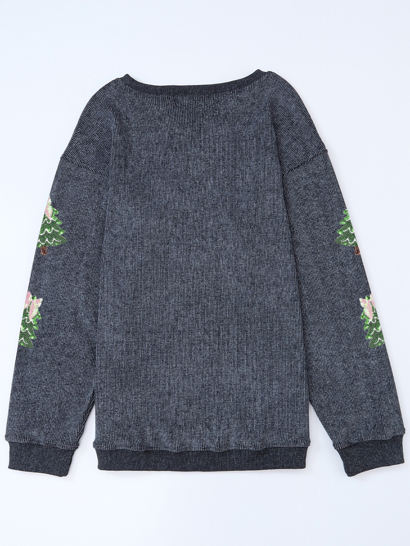 Ribbed Round Neck Sequin Christmas Tree Patched Baggy Sweatshirt