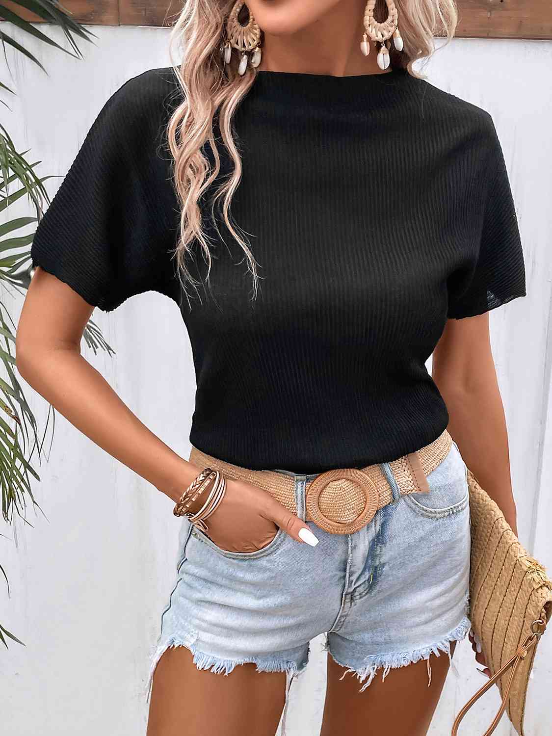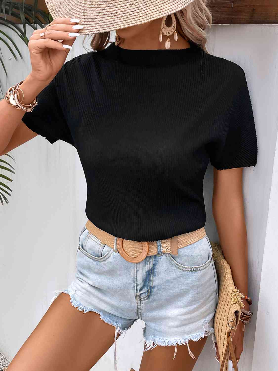 Ribbed Round Neck Short Sleeve T-Shirt