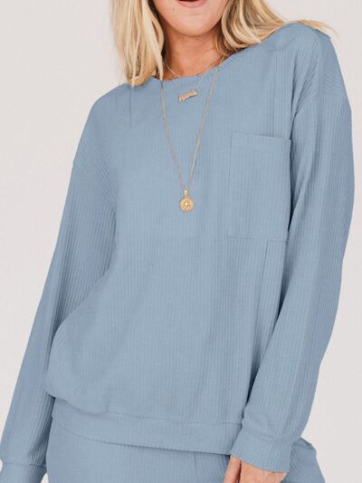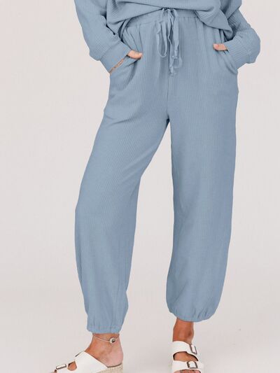 Ribbed Round Neck Sweatshirt and Drawstring Pants Set