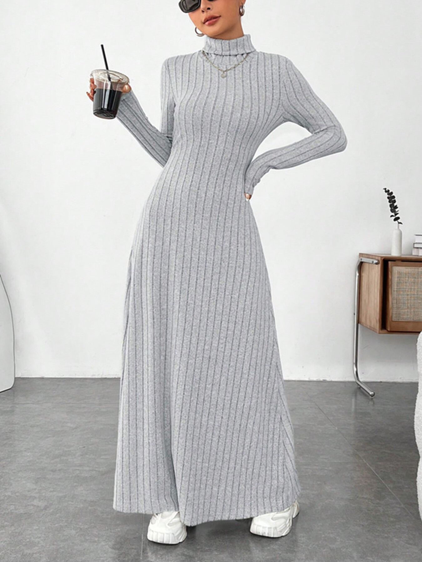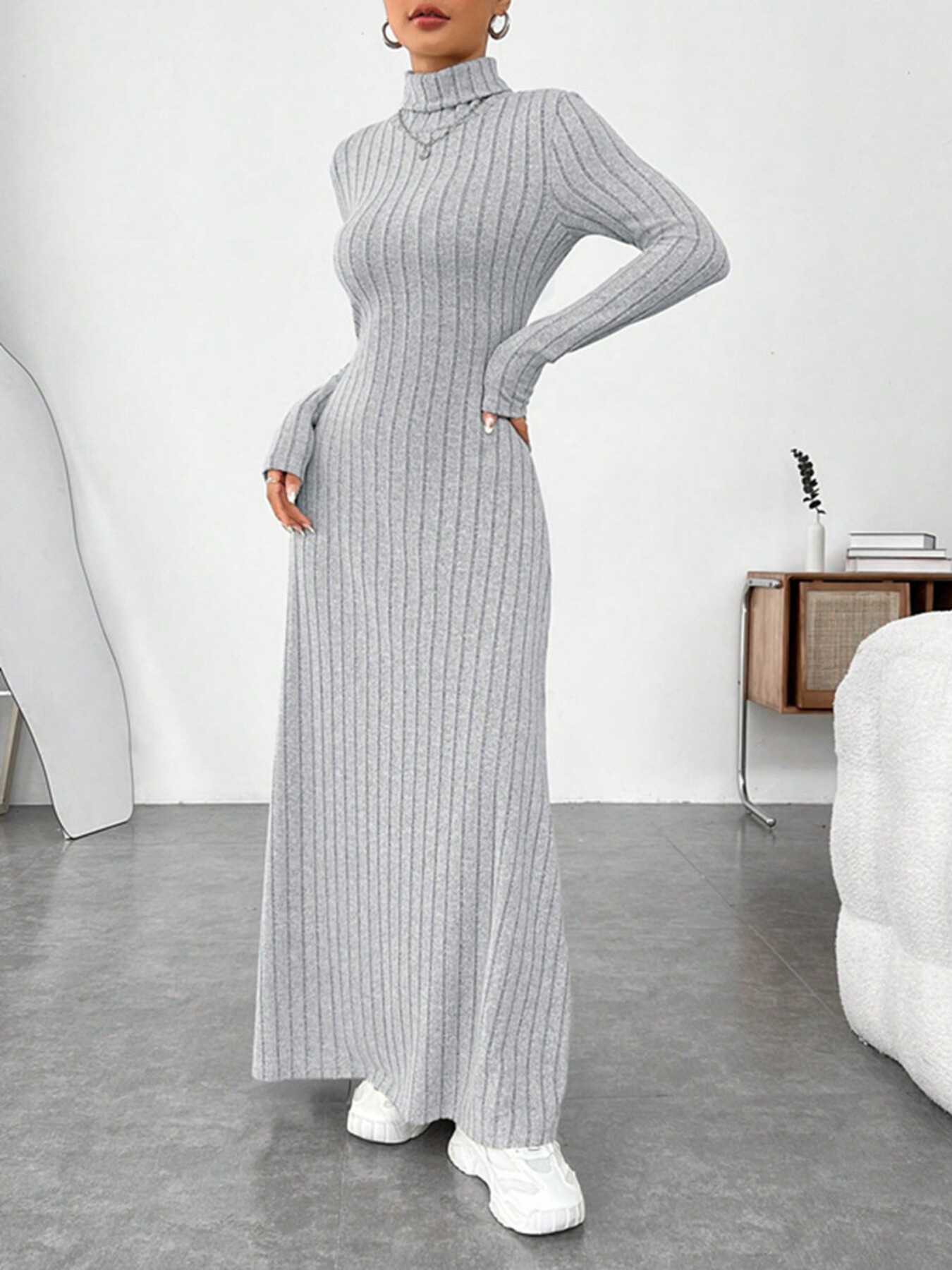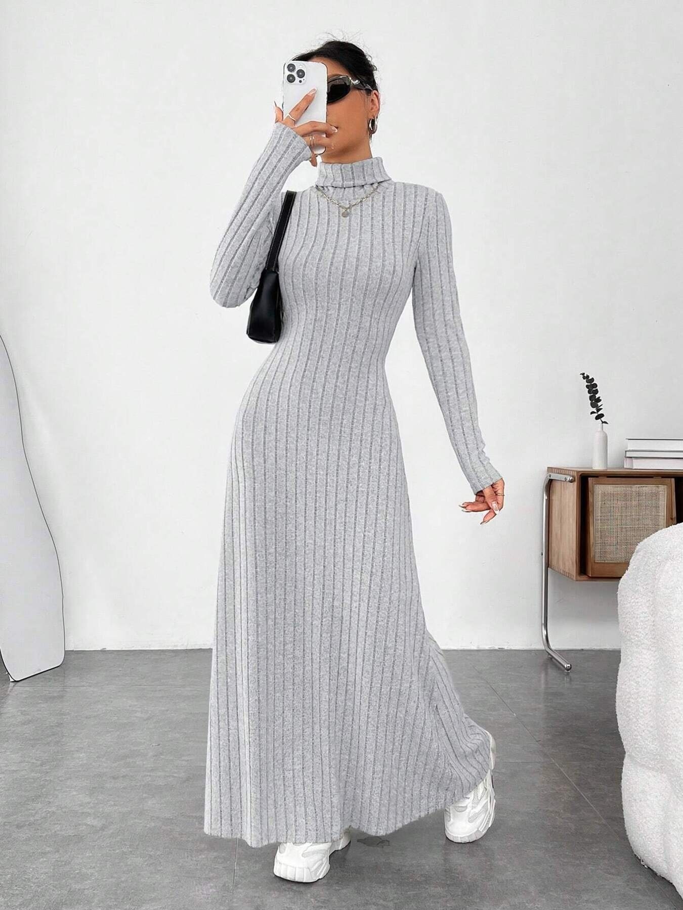 Ribbed Turtleneck Long Sleeve Maxi Knit Dress