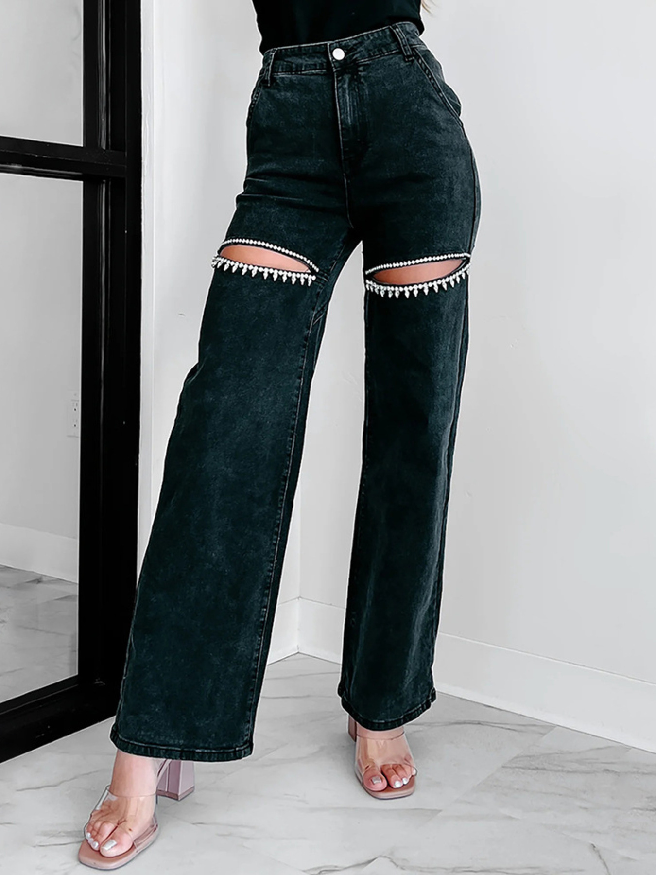 Ripped Wide Leg Wash Denim Jeans